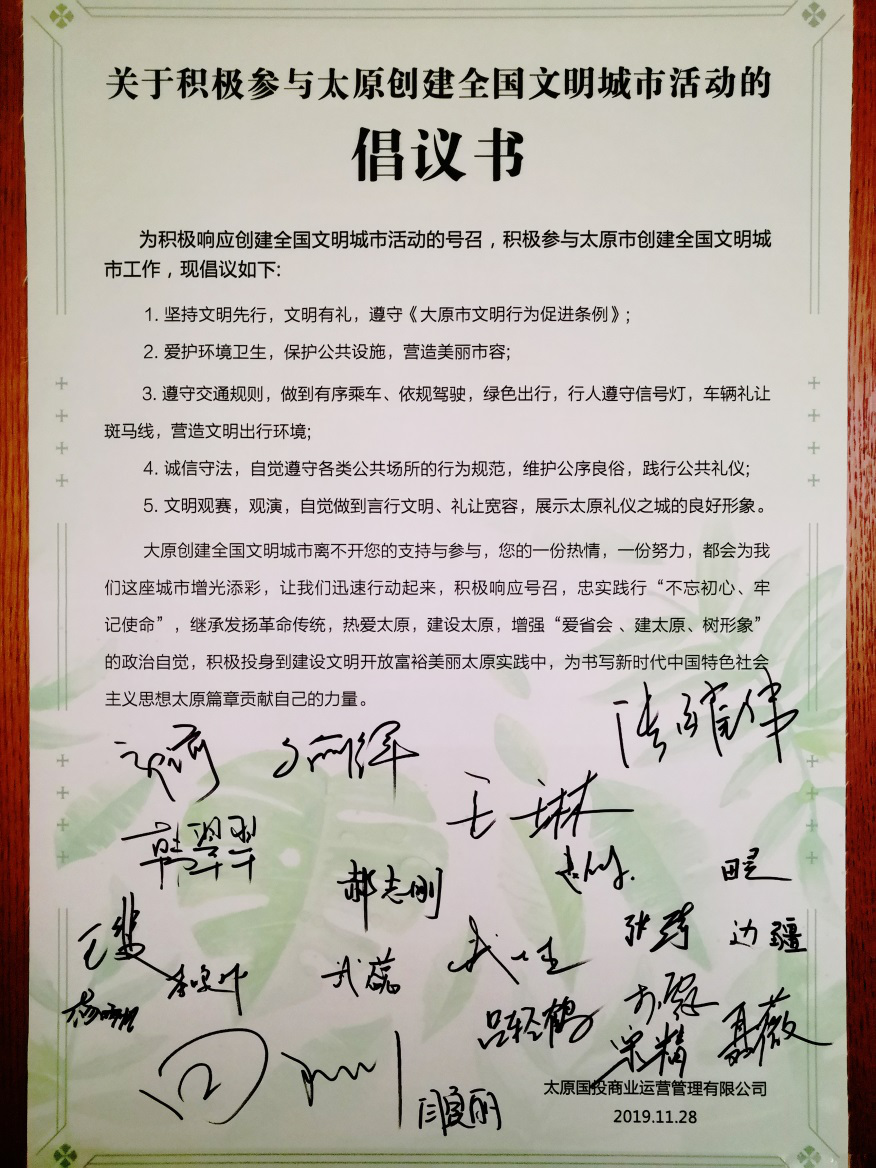 目前,太原市正在舉全市之力,堅決打贏“創(chuàng)城”這場攻堅戰(zhàn)。國投商管作為國投集團的全資子公司,擔負著晉陽湖公園管理運營的重任,作為窗口單位,要切實發(fā)揮好表率作用,要求全員參與,積極發(fā)出倡議,用實際行動來為創(chuàng)建文明城市匯聚強大的正能量。