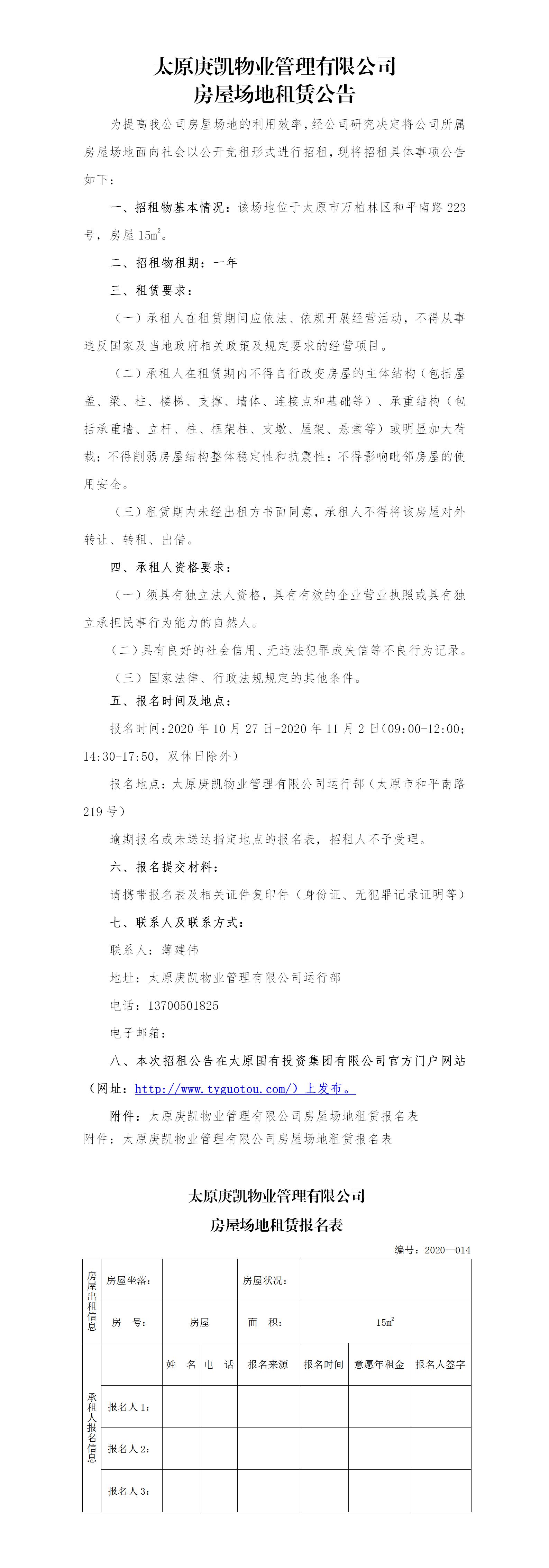 太原庚凱物業(yè)管理有限公司房屋場(chǎng)地租賃公告(十四)