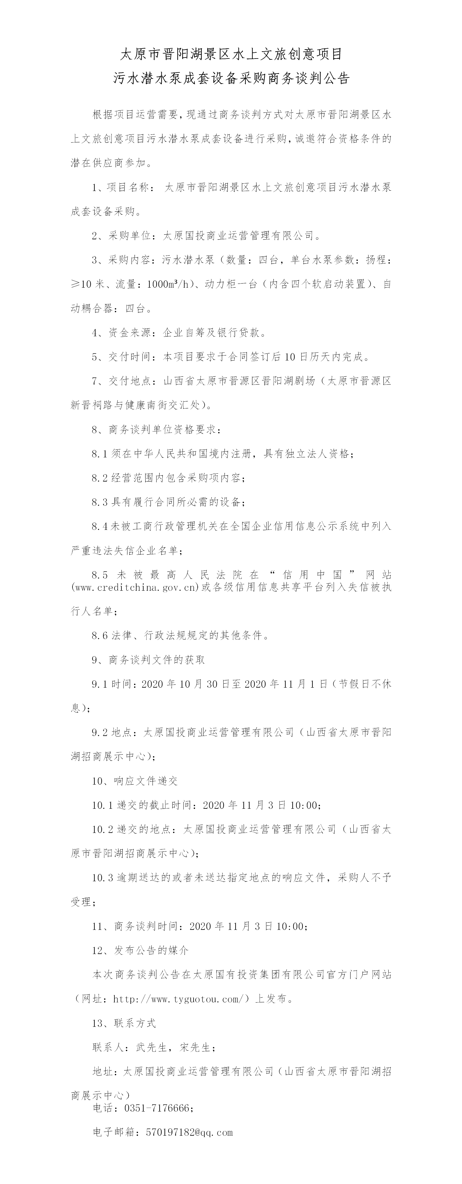 太原市晉陽湖景區(qū)水上文旅創(chuàng)意項(xiàng)目污水潛水泵成套設(shè)備采購(gòu)商務(wù)談判公告