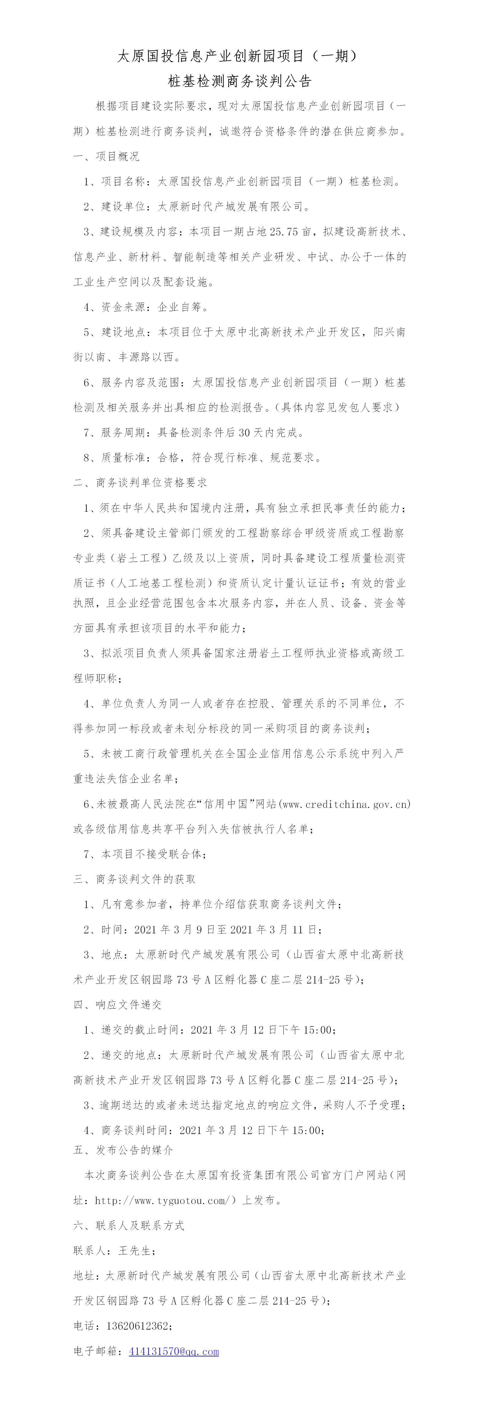 太原國投信息產(chǎn)業(yè)創(chuàng)新園項目(一期)樁基檢測商務談判公告