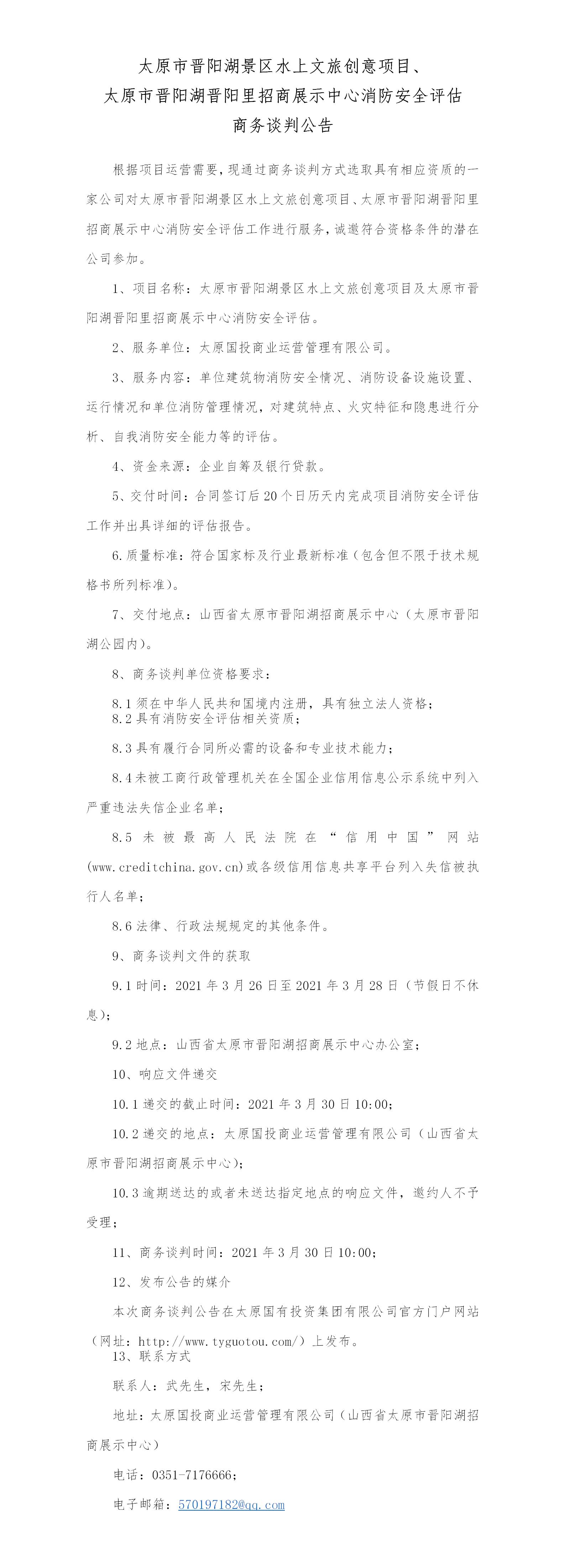 太原市晉陽湖景區(qū)水上文旅創(chuàng)意項(xiàng)目、晉陽湖晉陽里項(xiàng)目消防安全評估商務(wù)談判公告