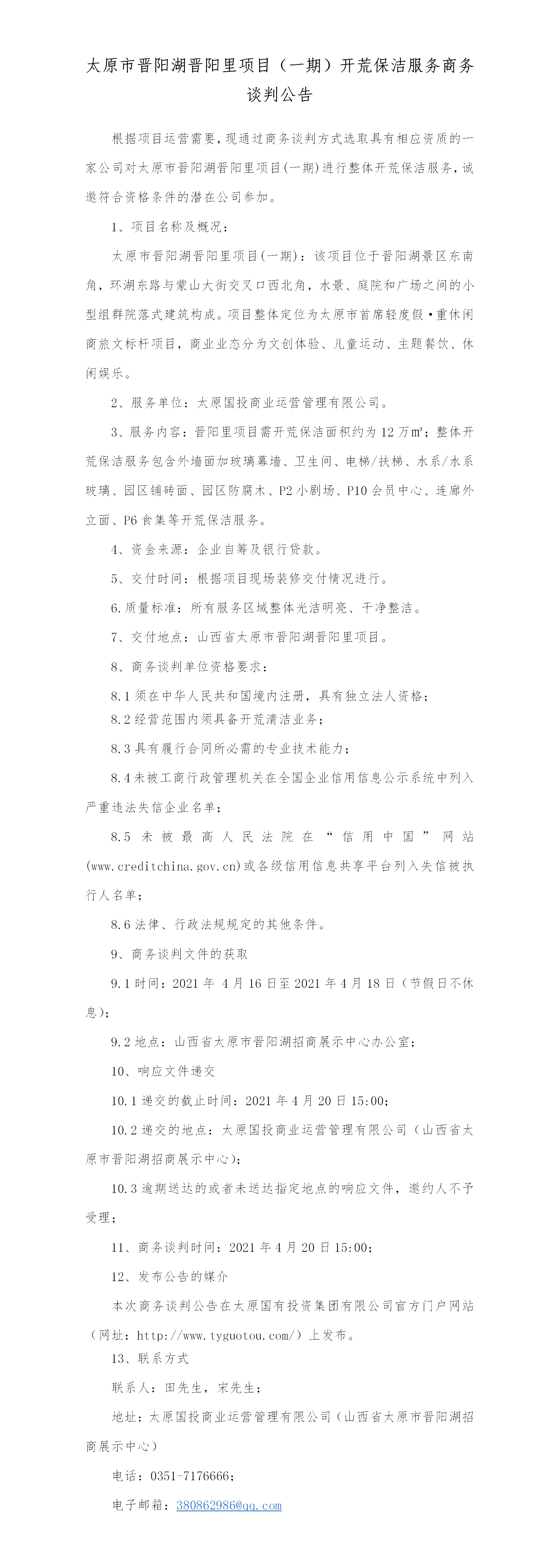 太原市晉陽(yáng)湖晉陽(yáng)里項(xiàng)目(一期)開荒保潔服務(wù)商務(wù)談判公告