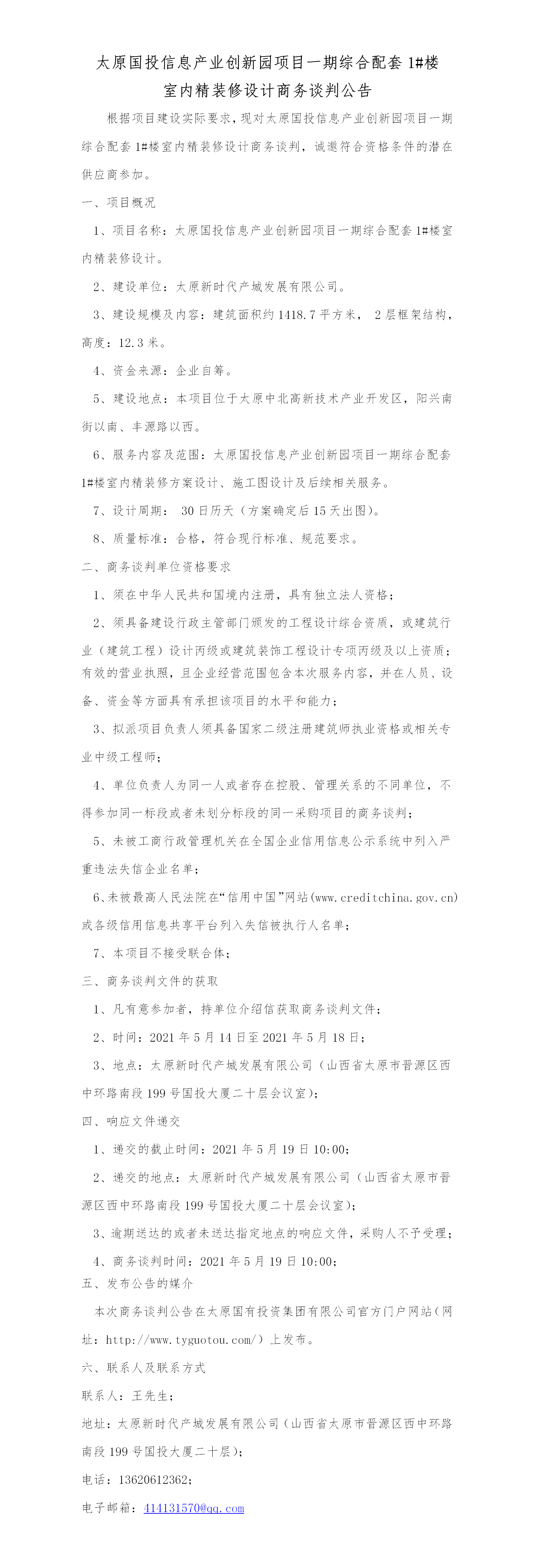 太原國投信息產(chǎn)業(yè)創(chuàng)新園項目一期綜合配套1#樓室內(nèi)精裝修設計商務談判公告