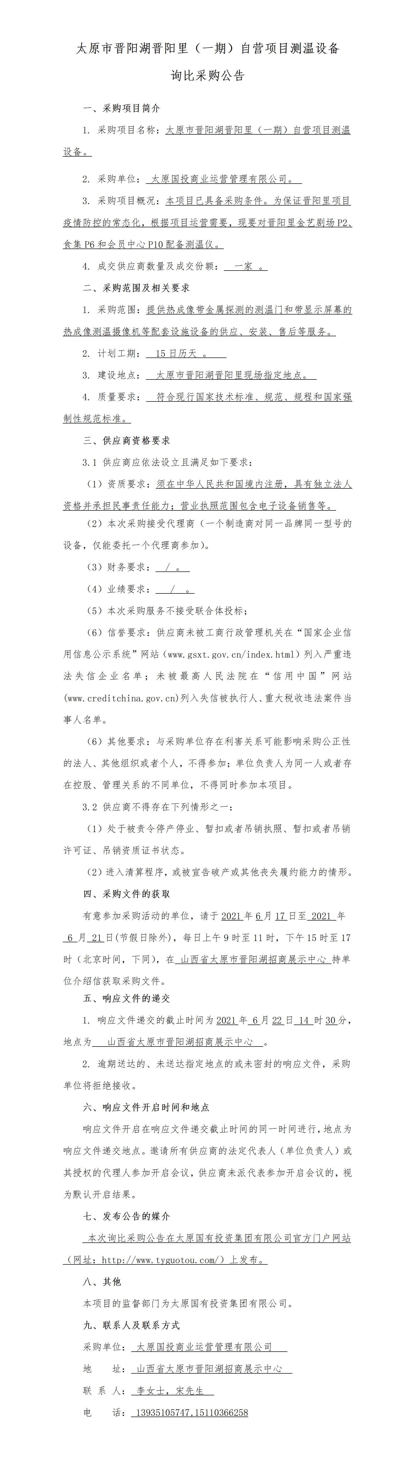 太原市晉陽湖晉陽里(一期)自營項目測溫設(shè)備詢比采購公告