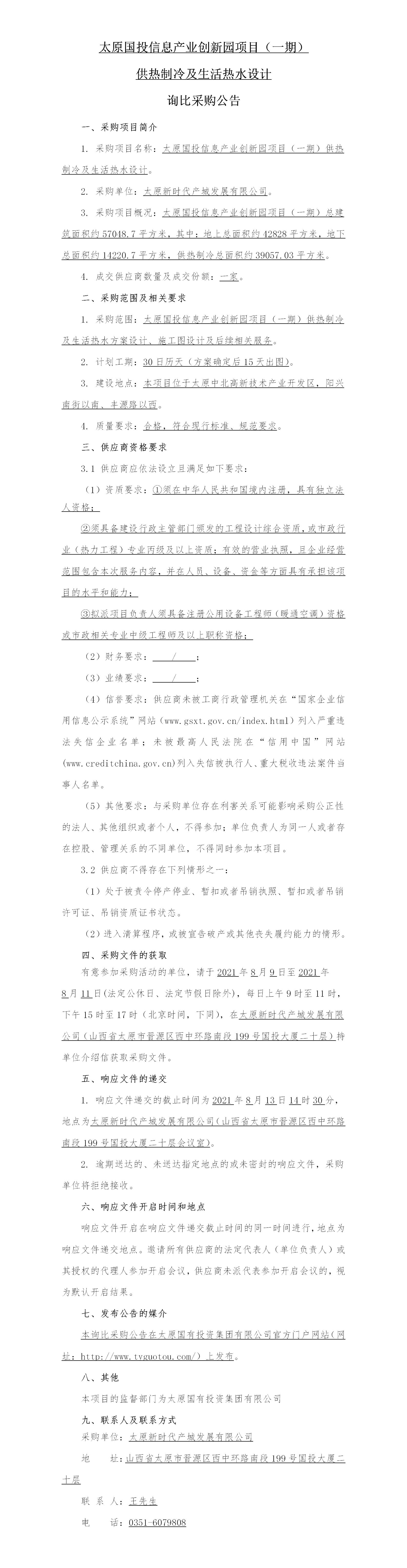 太原國(guó)投信息產(chǎn)業(yè)創(chuàng)新園項(xiàng)目(一期)供熱制冷及生活熱水設(shè)計(jì)詢(xún)比采購(gòu)公告