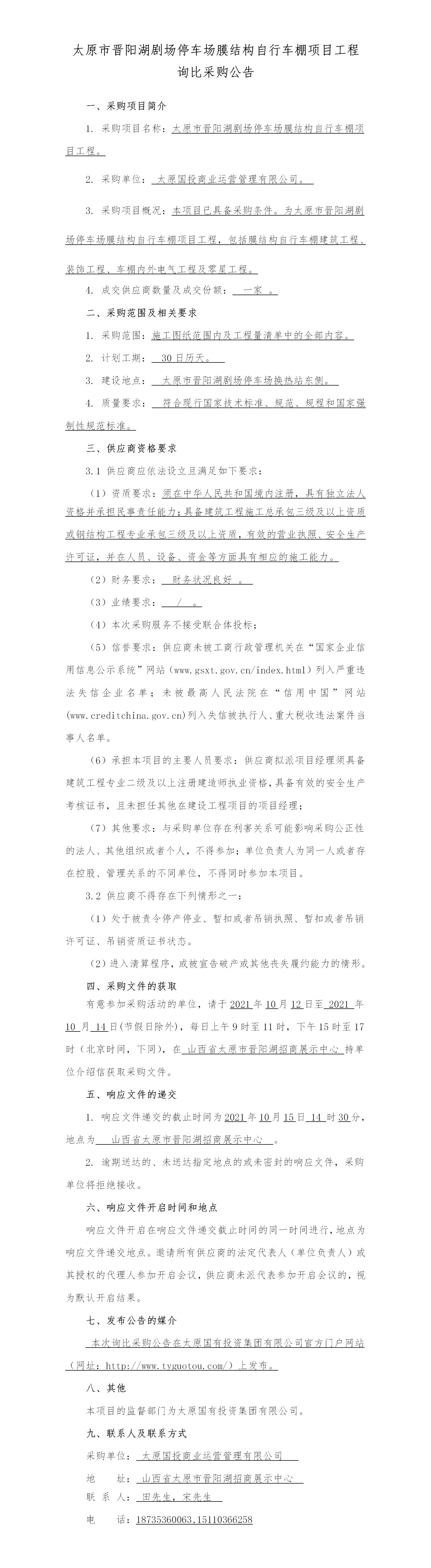 太原市晉陽湖劇場(chǎng)停車場(chǎng)膜結(jié)構(gòu)自行車棚項(xiàng)目工程公告