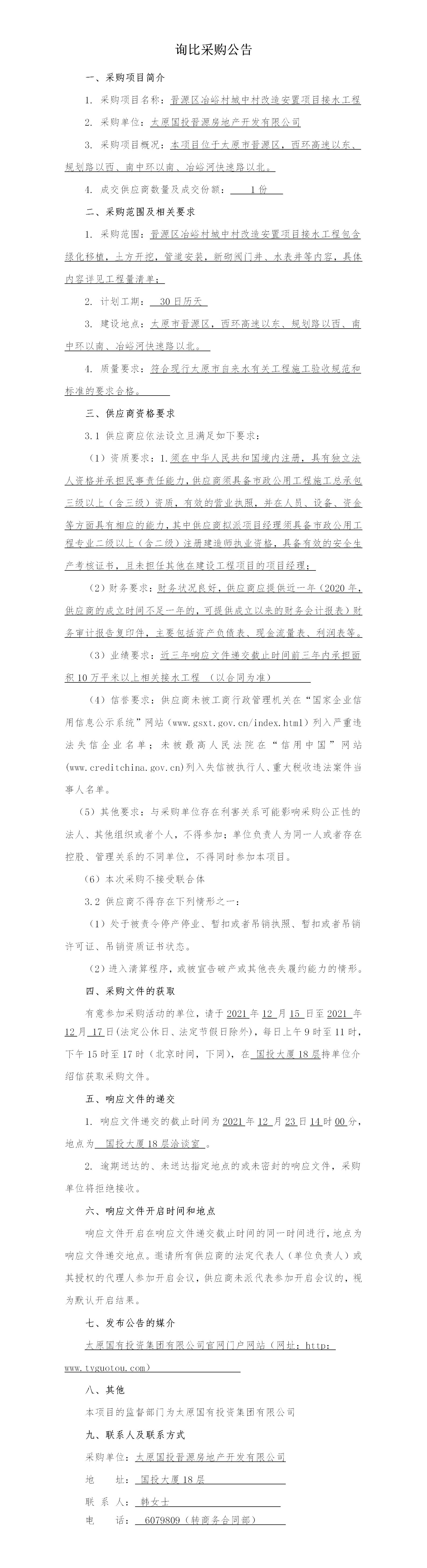 冶峪村城中村改造安置項目接水工程項目詢比公告