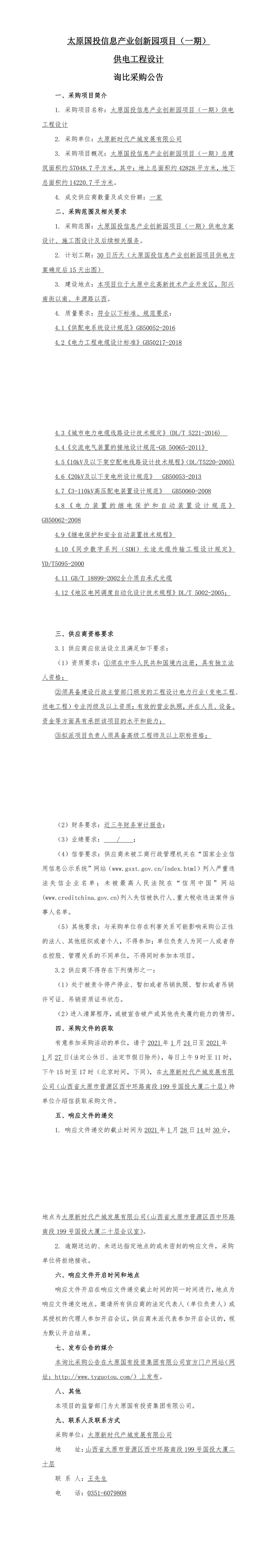 太原國(guó)投信息產(chǎn)業(yè)創(chuàng)新園項(xiàng)目(一期)供電工程設(shè)計(jì)詢比采購(gòu)公告