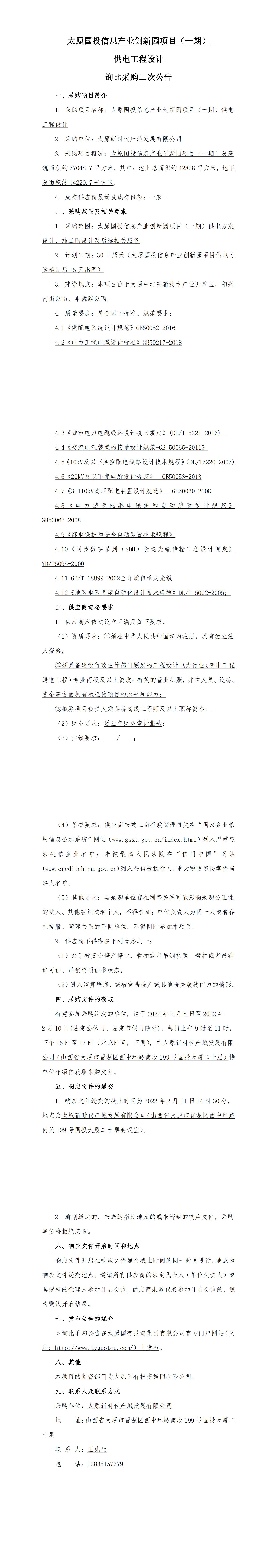 太原國(guó)投信息產(chǎn)業(yè)創(chuàng)新園項(xiàng)目(一期)供電工程設(shè)計(jì)詢比采購二次公告