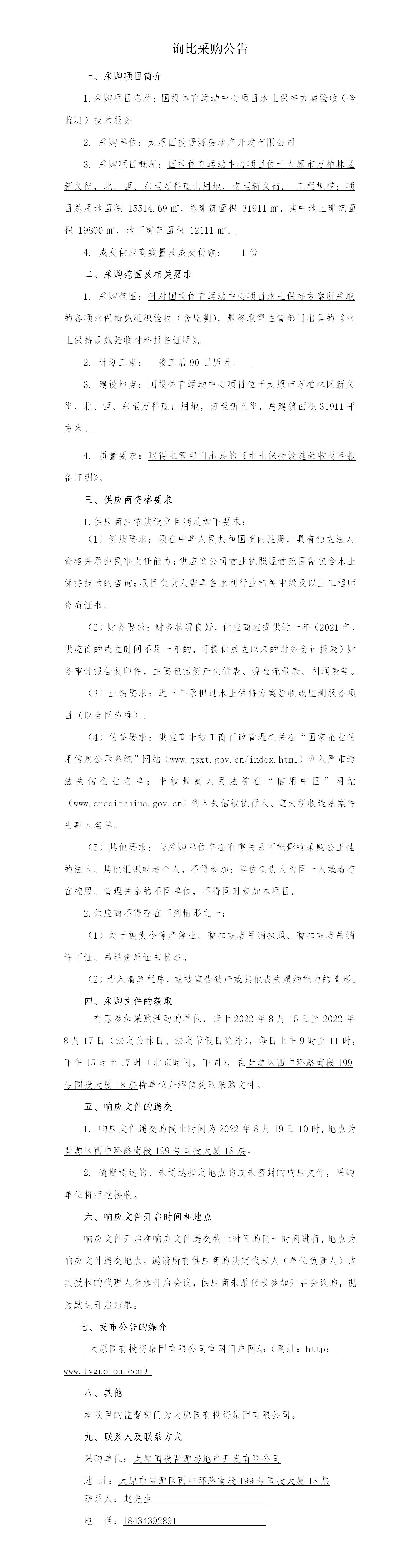 國投體育運動中心項目水土保持方案驗收(含監(jiān)測)技術(shù)服務(wù)詢比采購公告