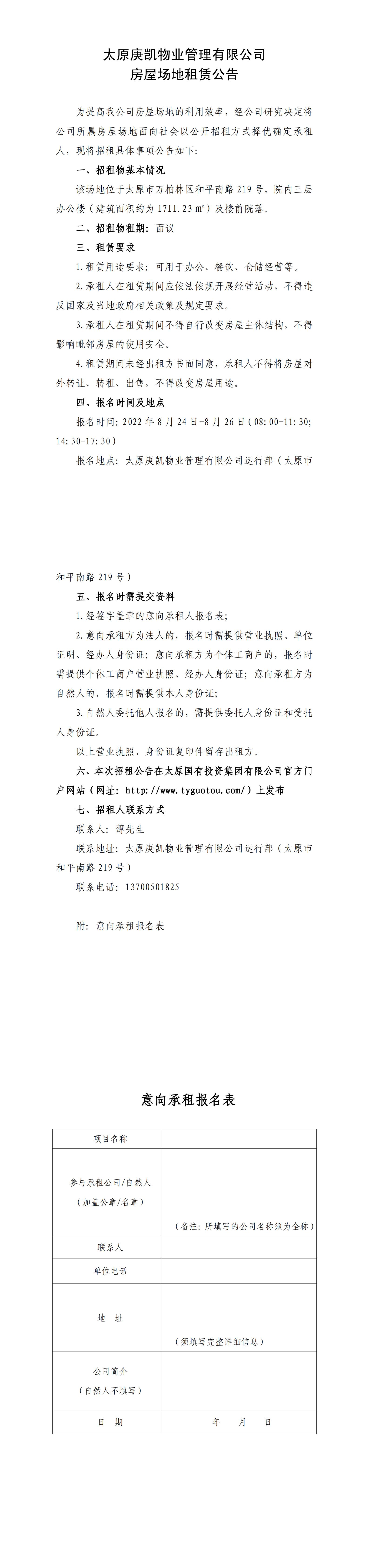 太原庚凱物業(yè)管理有限公司房屋場(chǎng)地租賃公告