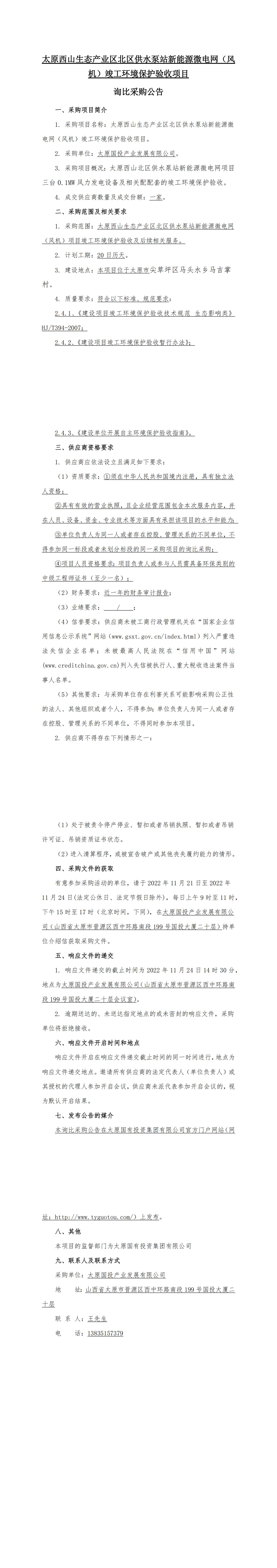 太原西山生態(tài)產(chǎn)業(yè)區(qū)北區(qū)供水泵站新能源微電網(wǎng)(風(fēng)機(jī))竣工環(huán)境保護(hù)驗(yàn)收詢比采購(gòu)公告