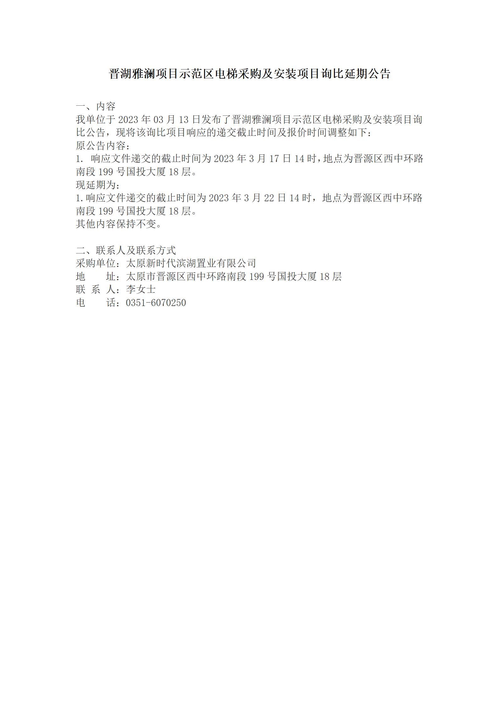 晉湖雅瀾項(xiàng)目示范區(qū)電梯采購(gòu)及安裝項(xiàng)目詢比延期公告