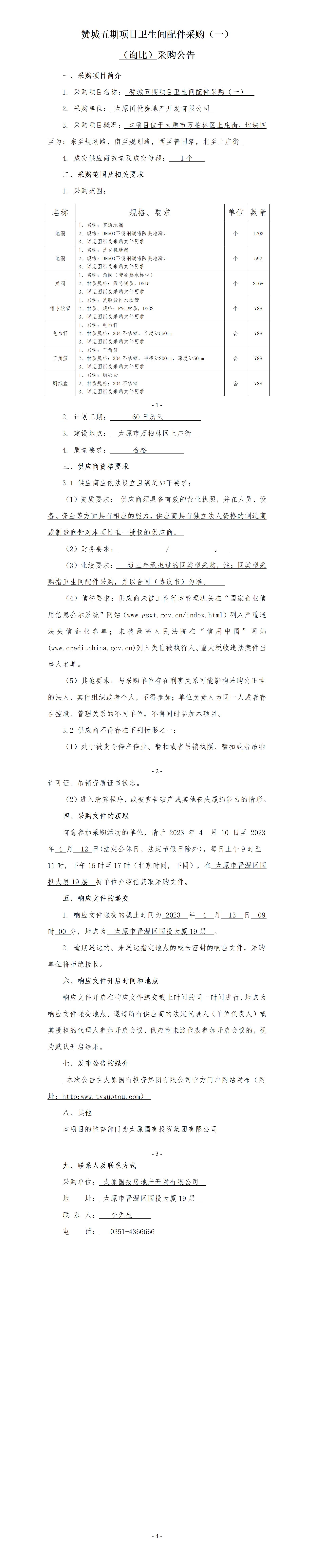 贊城五期項(xiàng)目衛(wèi)生間配件采購(一)詢比采購公告