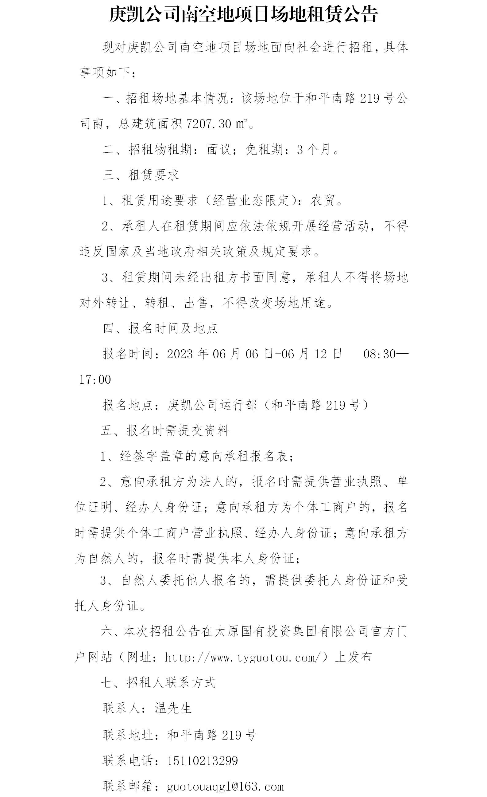 庚凱公司南空地項目場地租賃公告