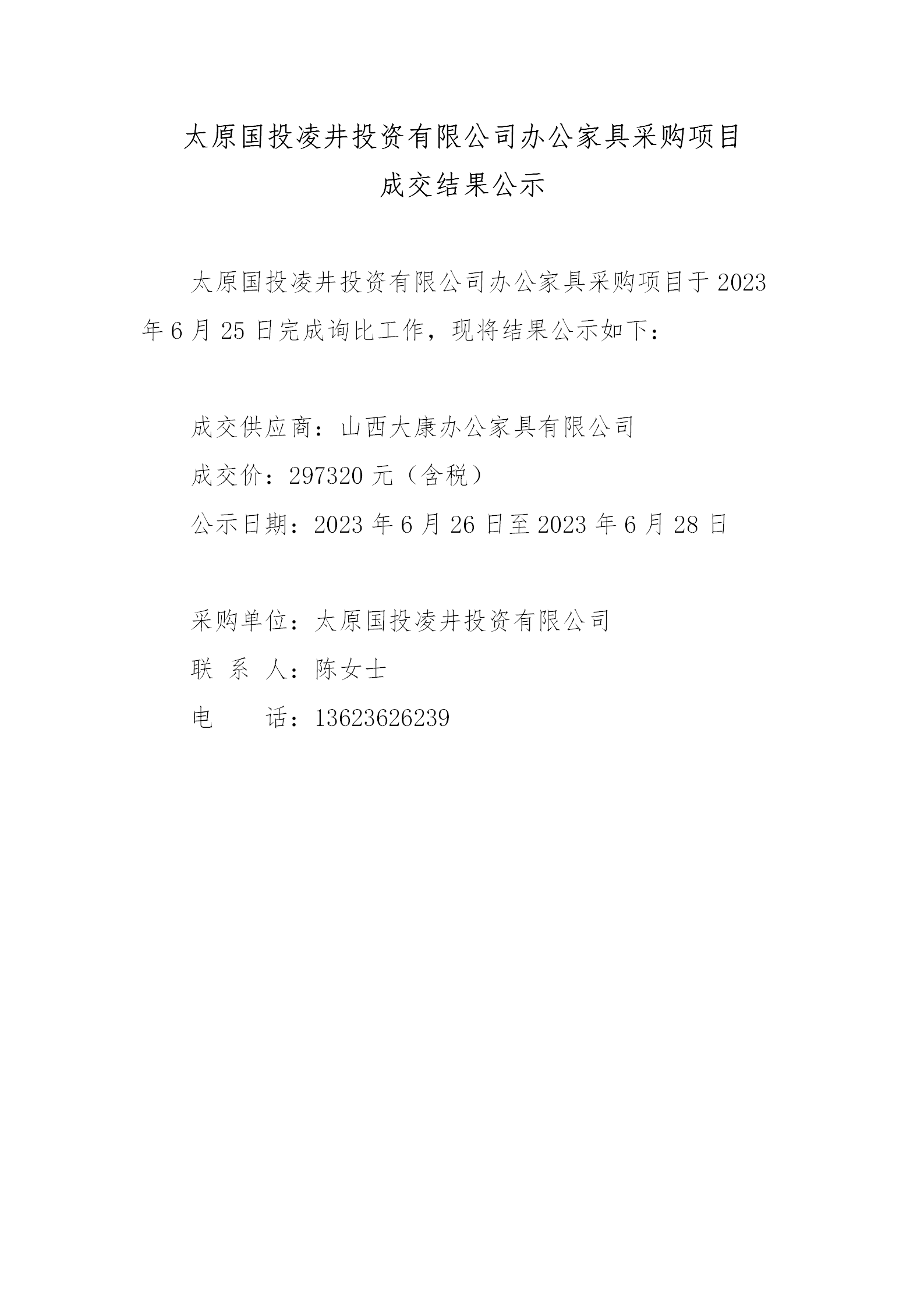 太原國投凌井投資有限公司辦公家具采購項目成交結(jié)果公示