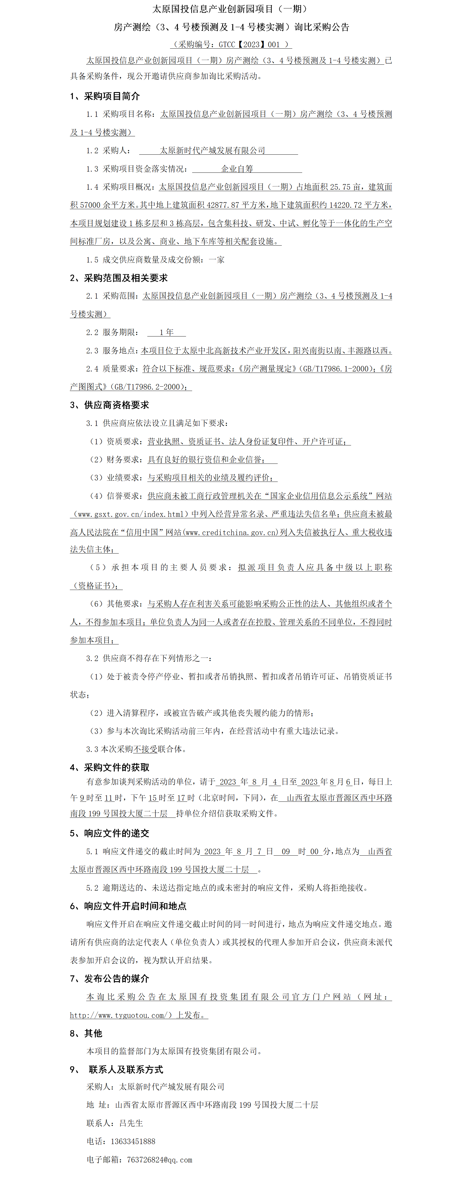 太原國投信息產(chǎn)業(yè)創(chuàng)新園項(xiàng)目(一期)房產(chǎn)測繪(3、4號樓預(yù)測及1-4號樓實(shí)測)詢比采購公告