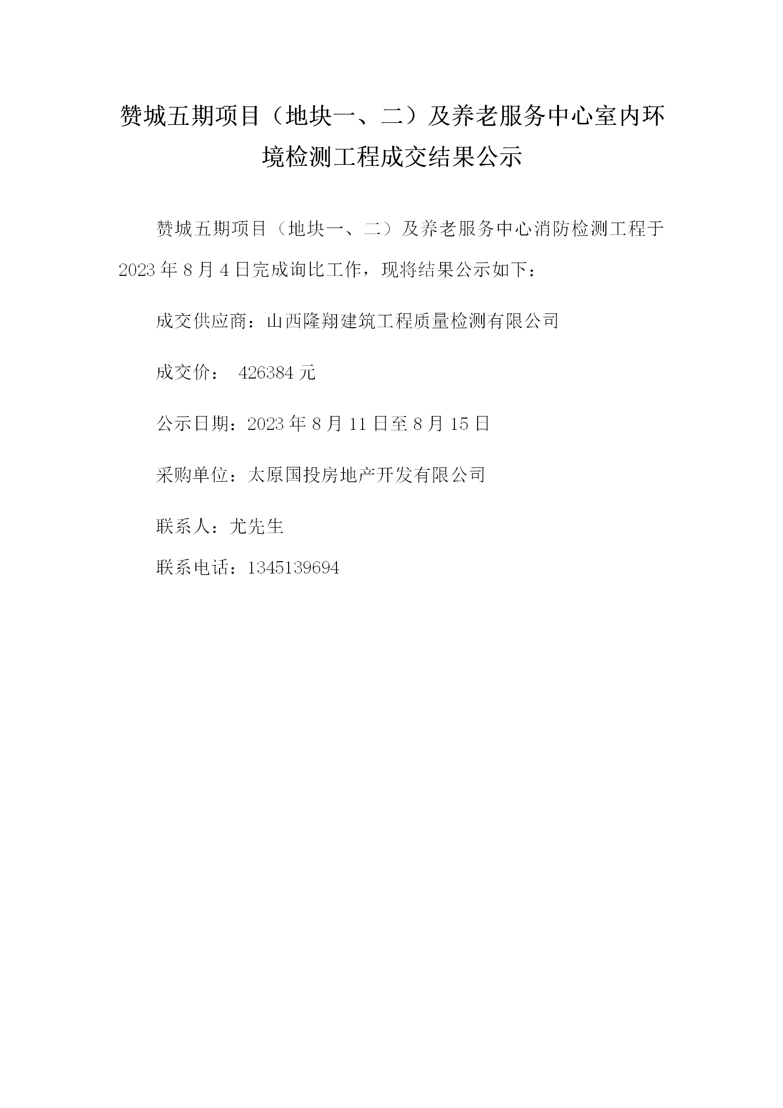 贊城五期項(xiàng)目(地塊一、二)及養(yǎng)老服務(wù)中心室內(nèi)環(huán)境檢測工程成交結(jié)果公示
