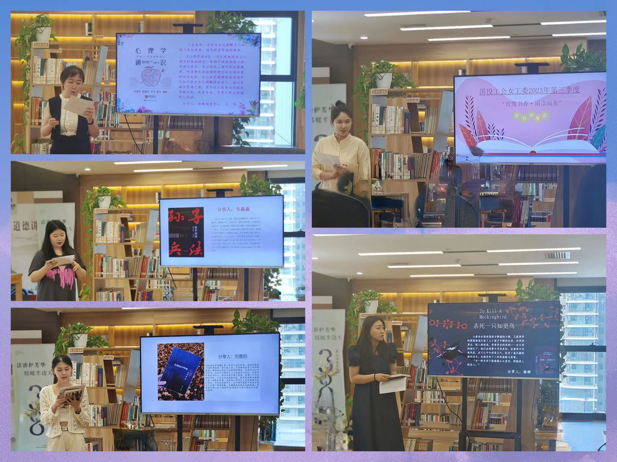 活動現(xiàn)場 ,共有9名新入職女職工進行了分享,大家結合工作經(jīng)歷和生活感悟交流體會,生動形象地詮釋了“多讀書、讀好書”的獨特魅力。此次分享包含了人際溝通、生命思考、愛與責任等主題書籍,以楊柳分享的《殺死一只知更鳥》開始,介紹了對偏見的反思,對人性光輝的贊揚與傳遞,一遍又一遍喚醒內(nèi)心的正直、勇敢和善良。分享者以各種形式表達著自己的讀書見解,充分調(diào)動起了讀書求知的熱情。