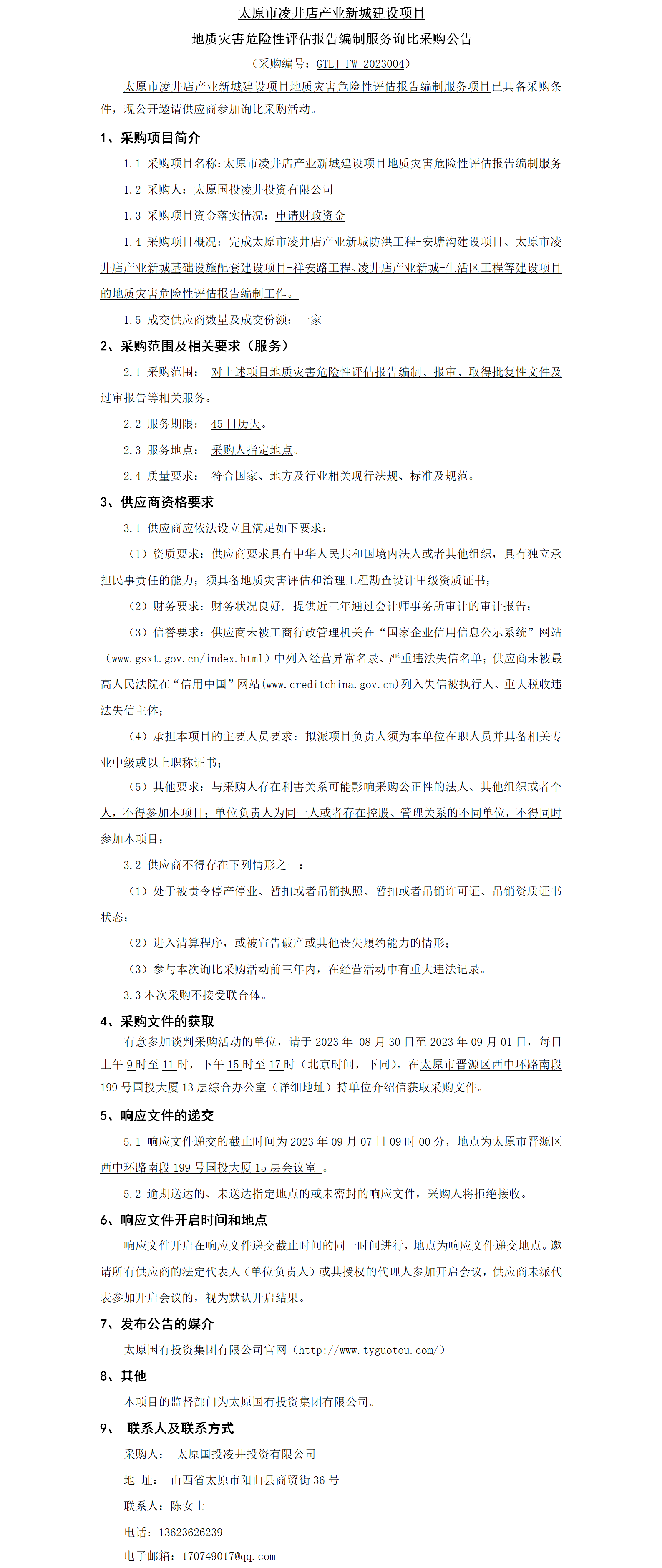 太原市凌井店產(chǎn)業(yè)新城建設(shè)項(xiàng)目地質(zhì)災(zāi)害危險(xiǎn)性評(píng)估報(bào)告編制服務(wù)采購(gòu)項(xiàng)目詢比采購(gòu)公告