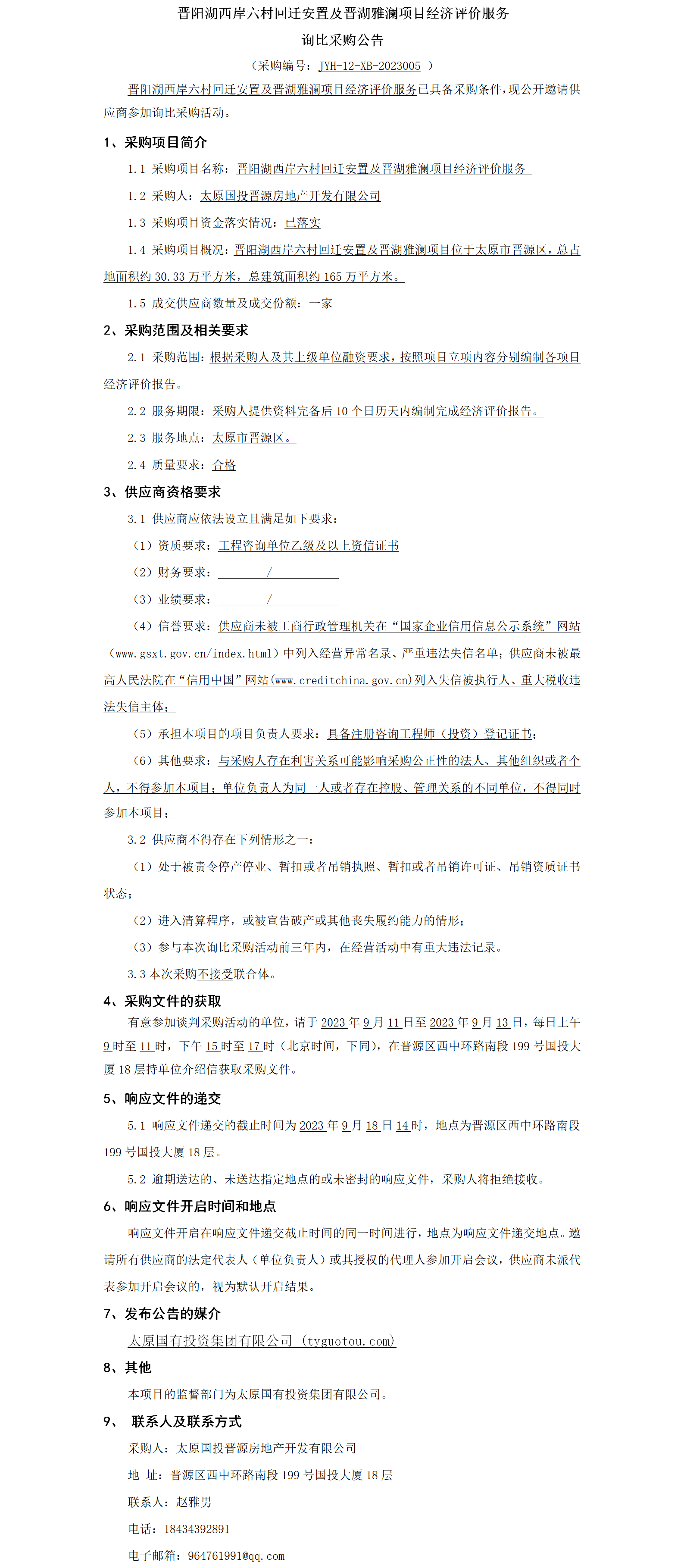 晉陽(yáng)湖西岸六村回遷安置及晉湖雅瀾項(xiàng)目經(jīng)濟(jì)評(píng)價(jià)服務(wù)詢比采購(gòu)公告
