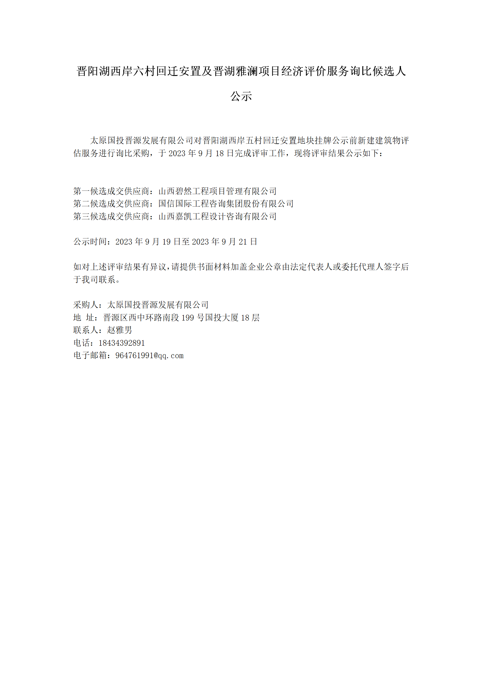 晉陽湖西岸六村回遷安置及晉湖雅瀾項目經(jīng)濟評價服務詢比候選人公示