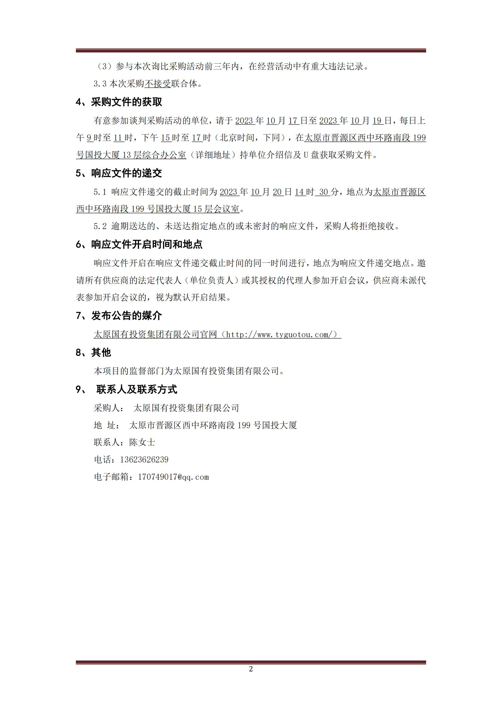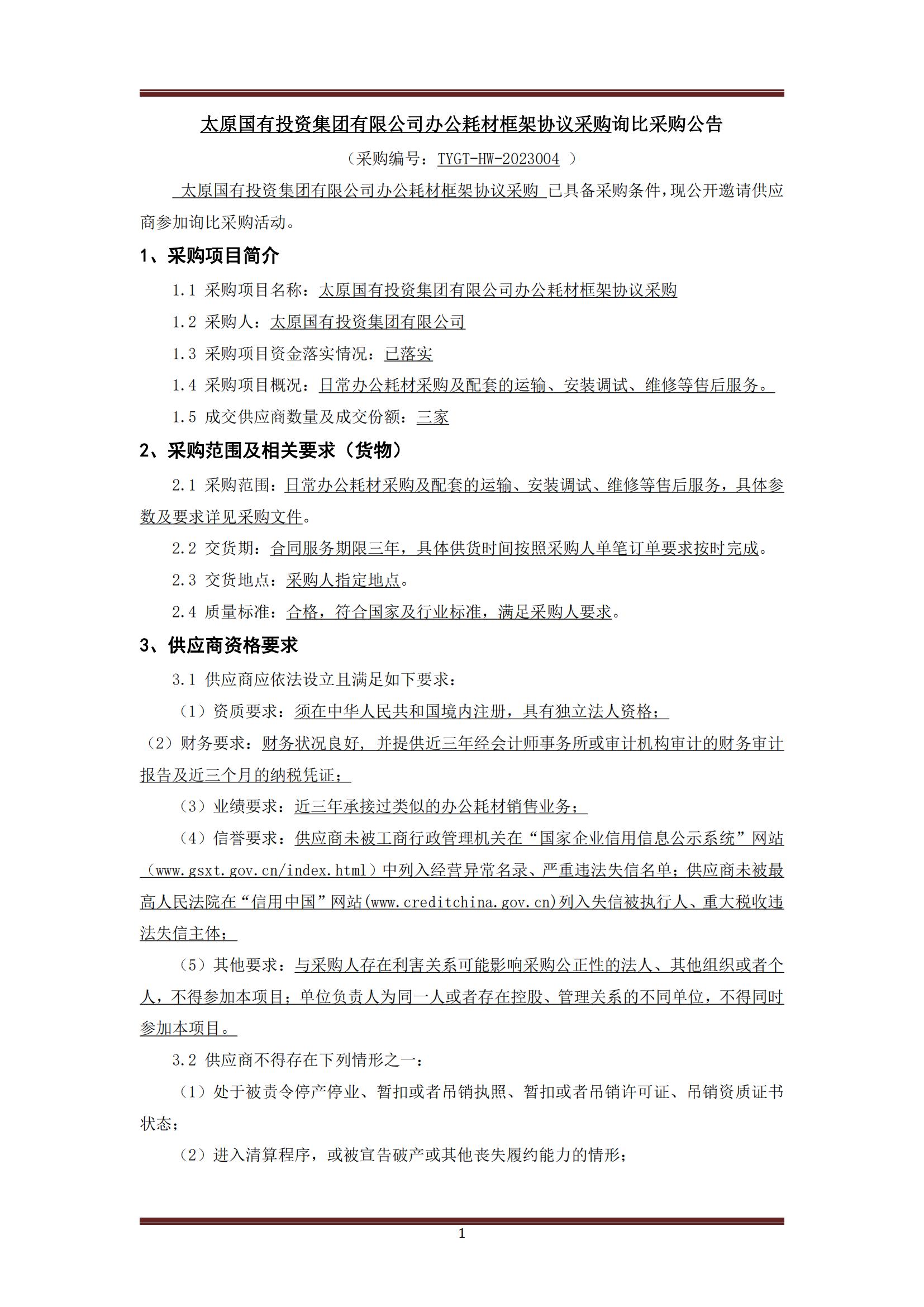 太原國有投資集團有限公司辦公耗材采購詢比公告