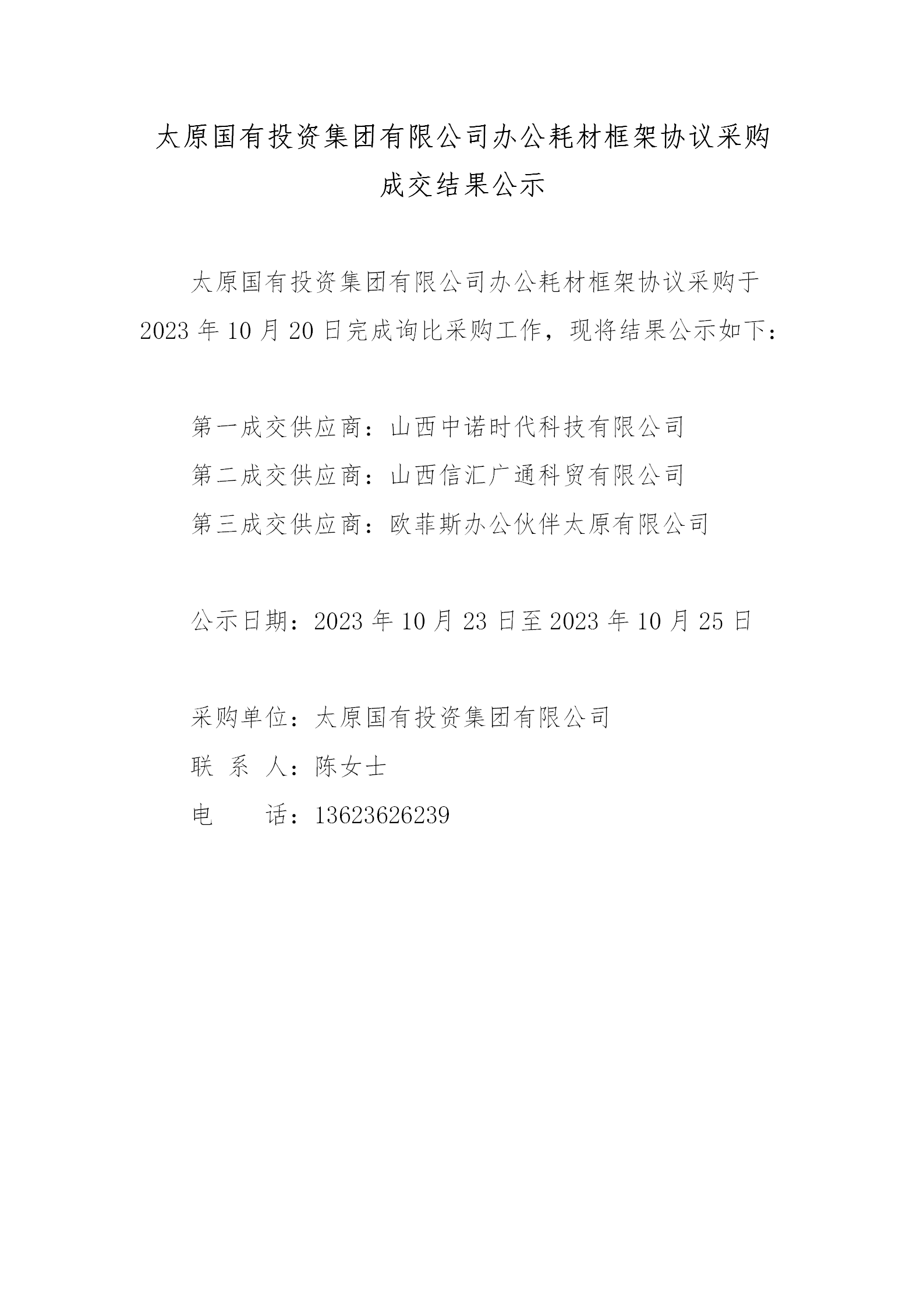 太原國有投資集團有限公司辦公耗材框架協(xié)議采購成交結(jié)果公示
