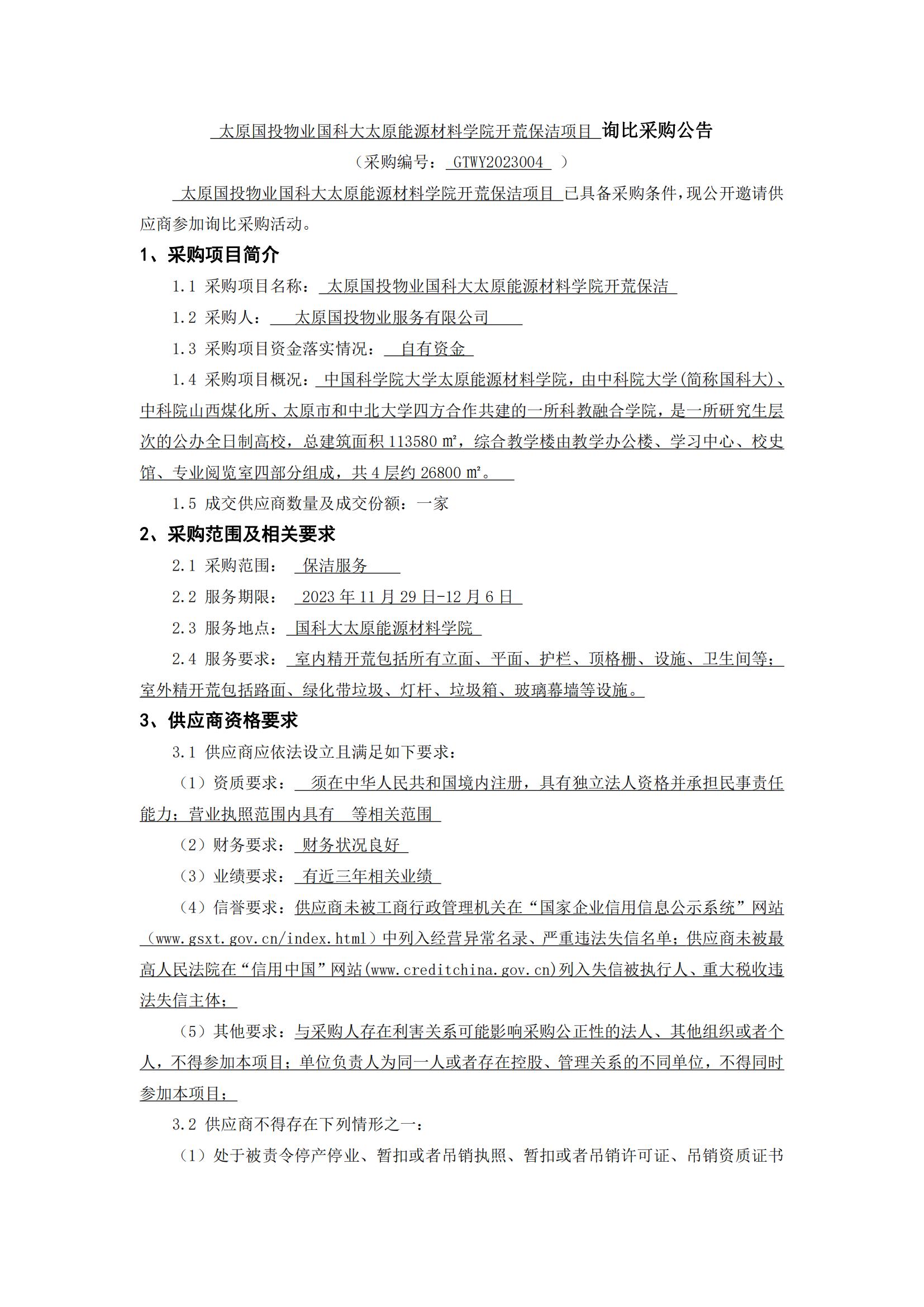 太原國投物業(yè)國科大太原能源材料學(xué)院開荒保潔項(xiàng)目詢比采購公告