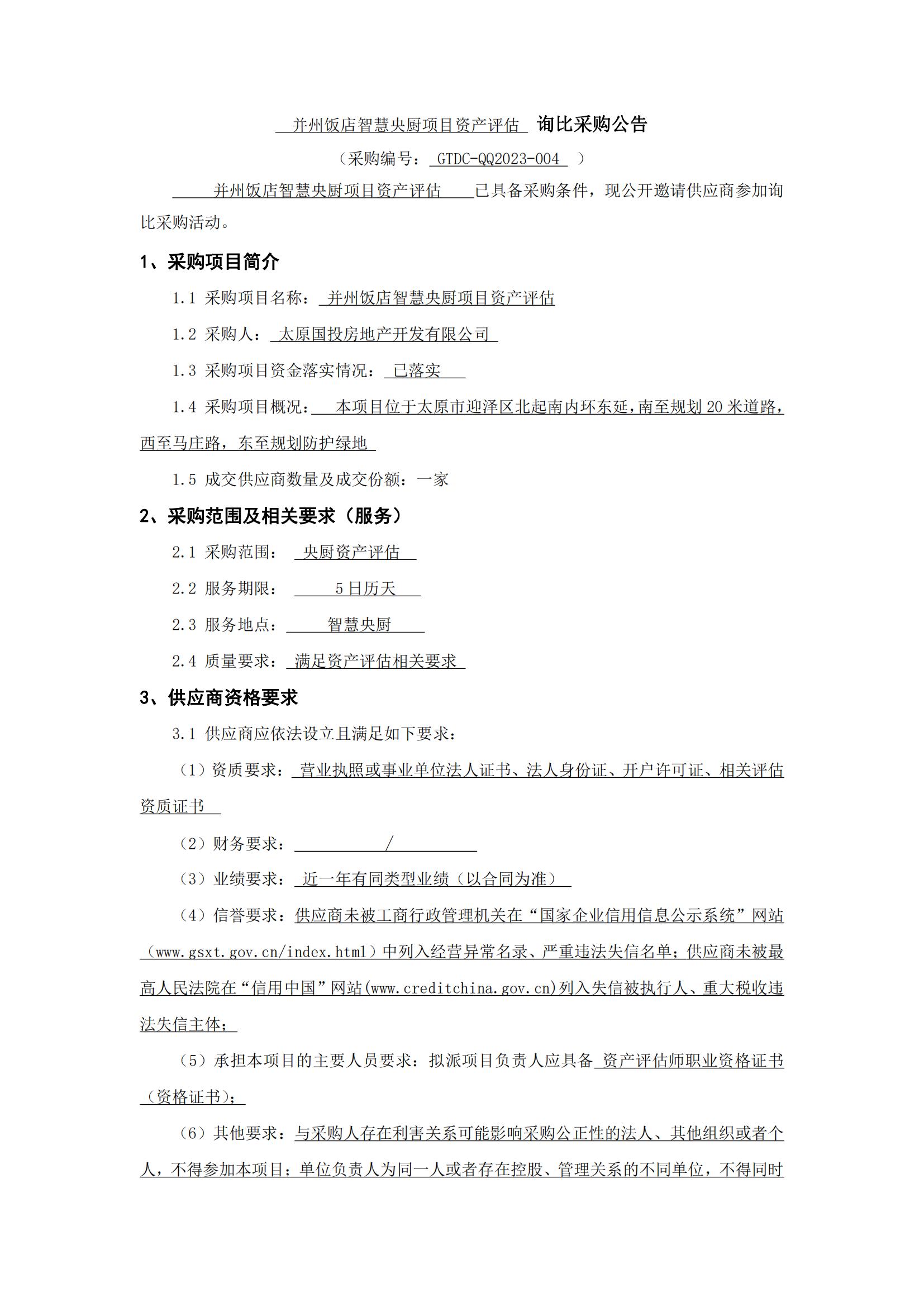 并州飯店智慧央廚項目資產(chǎn)評估 詢比采購公告
