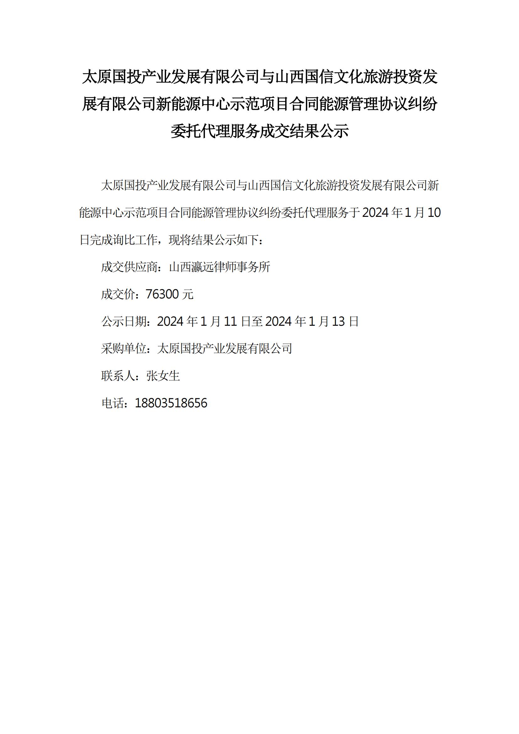 太原國(guó)投產(chǎn)業(yè)發(fā)展有限公司與山西國(guó)信文化旅游投資發(fā)展有限公司新能源中心示范項(xiàng)目合同能源管理協(xié)議糾紛委托代理成交結(jié)果公示