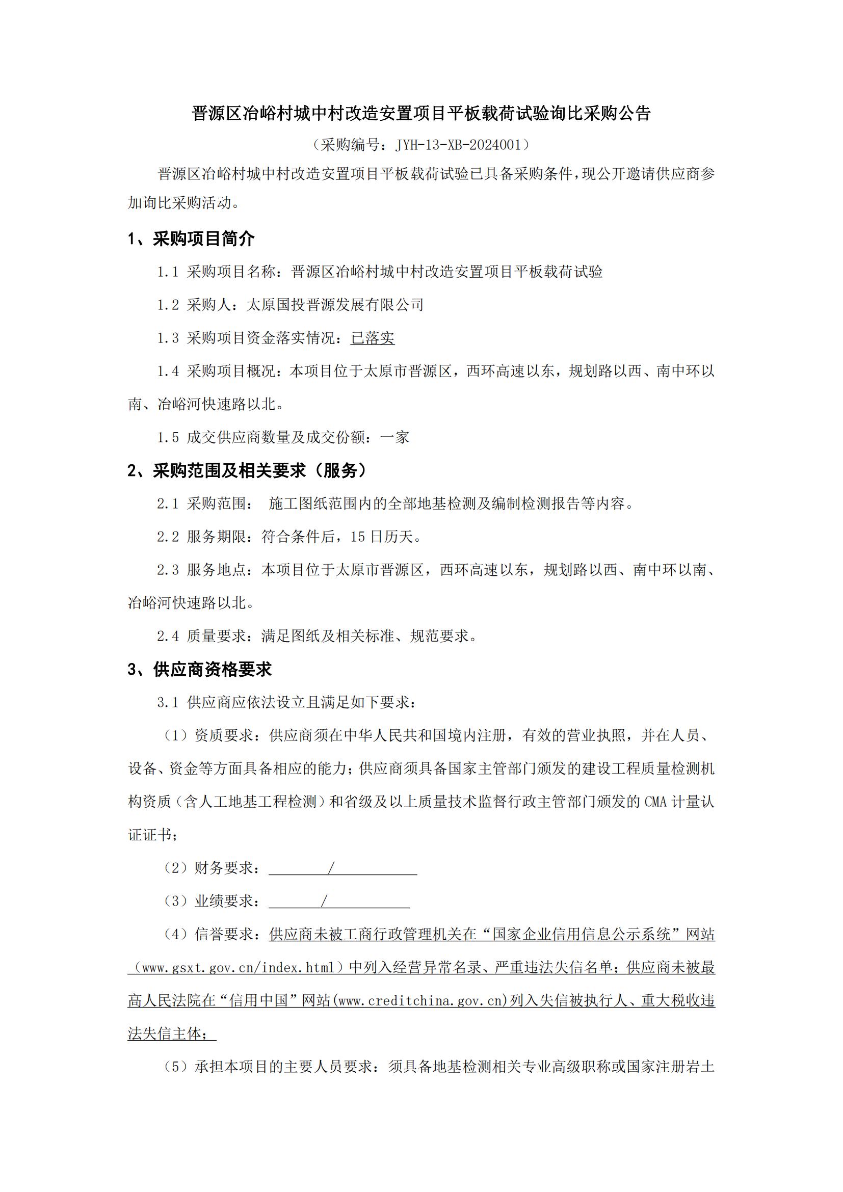 晉源區(qū)冶峪村城中村改造安置項目平板載荷試驗詢比采購公告