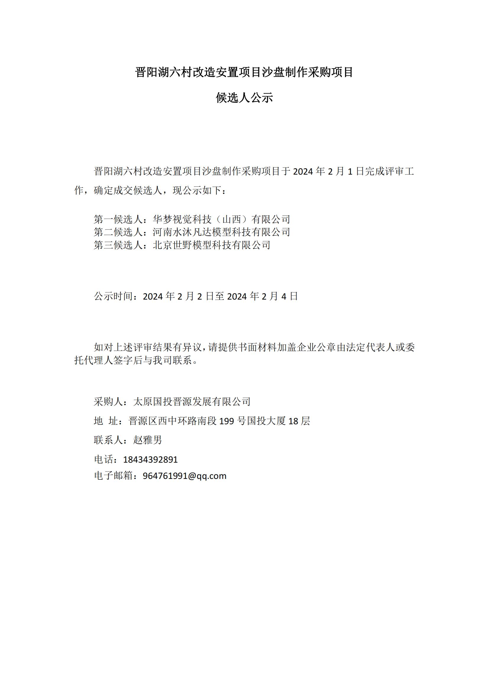 晉陽湖六村改造安置項目沙盤制作采購項目候選人公示