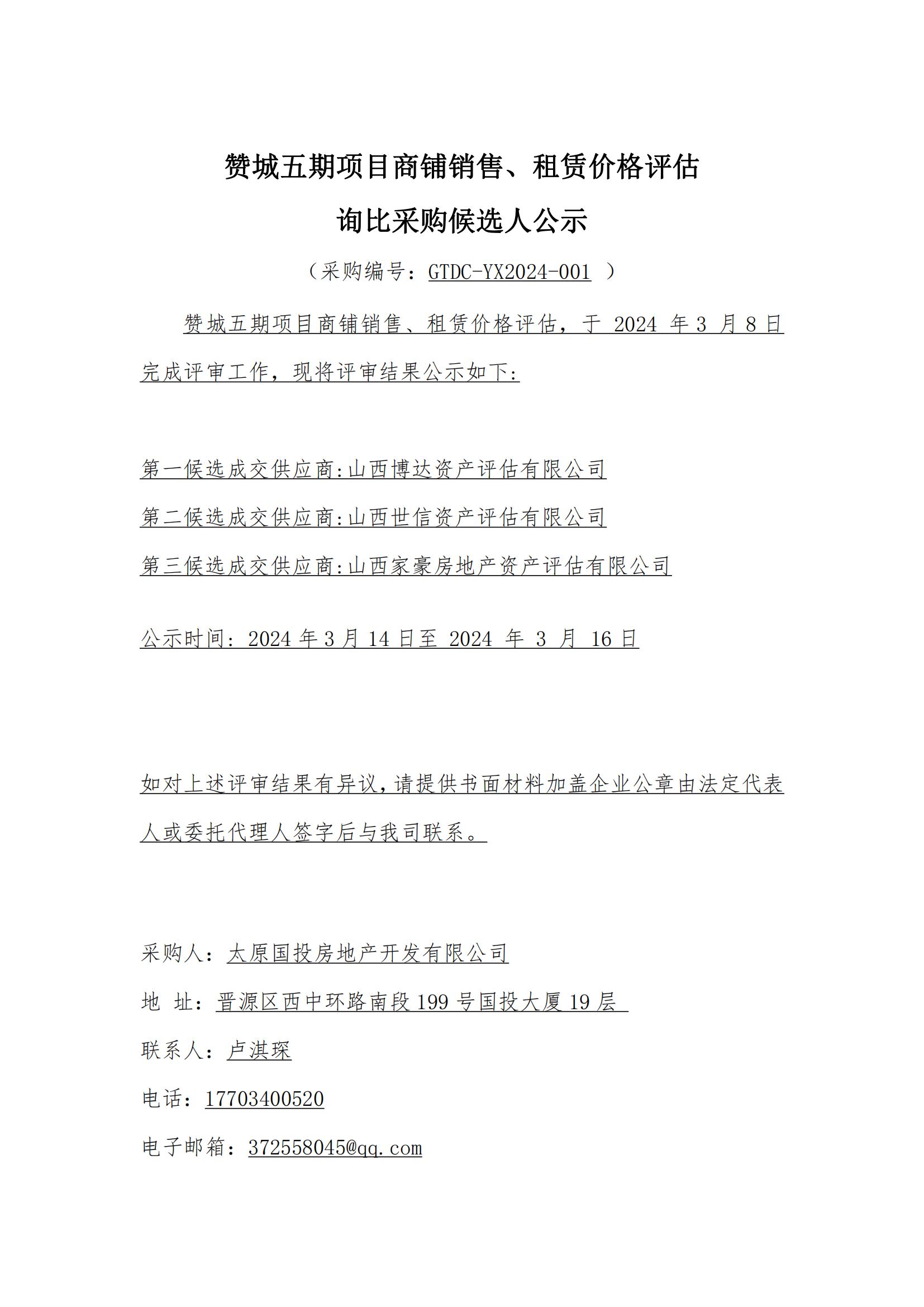 贊城五期項(xiàng)目商鋪銷售、租賃價格評估詢比采購候選人公示