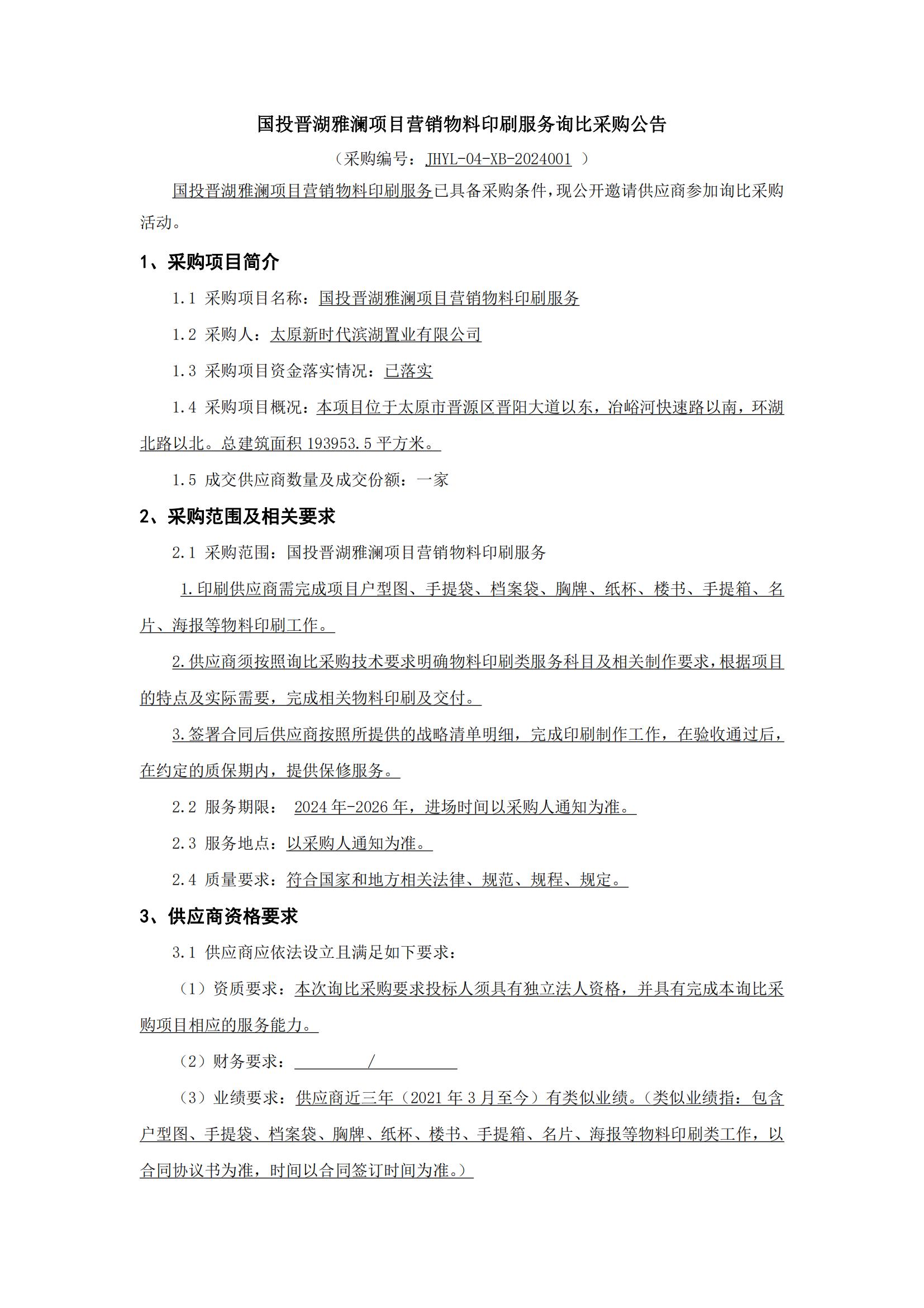 國投晉湖雅瀾項目營銷物料印刷服務詢比采購公告