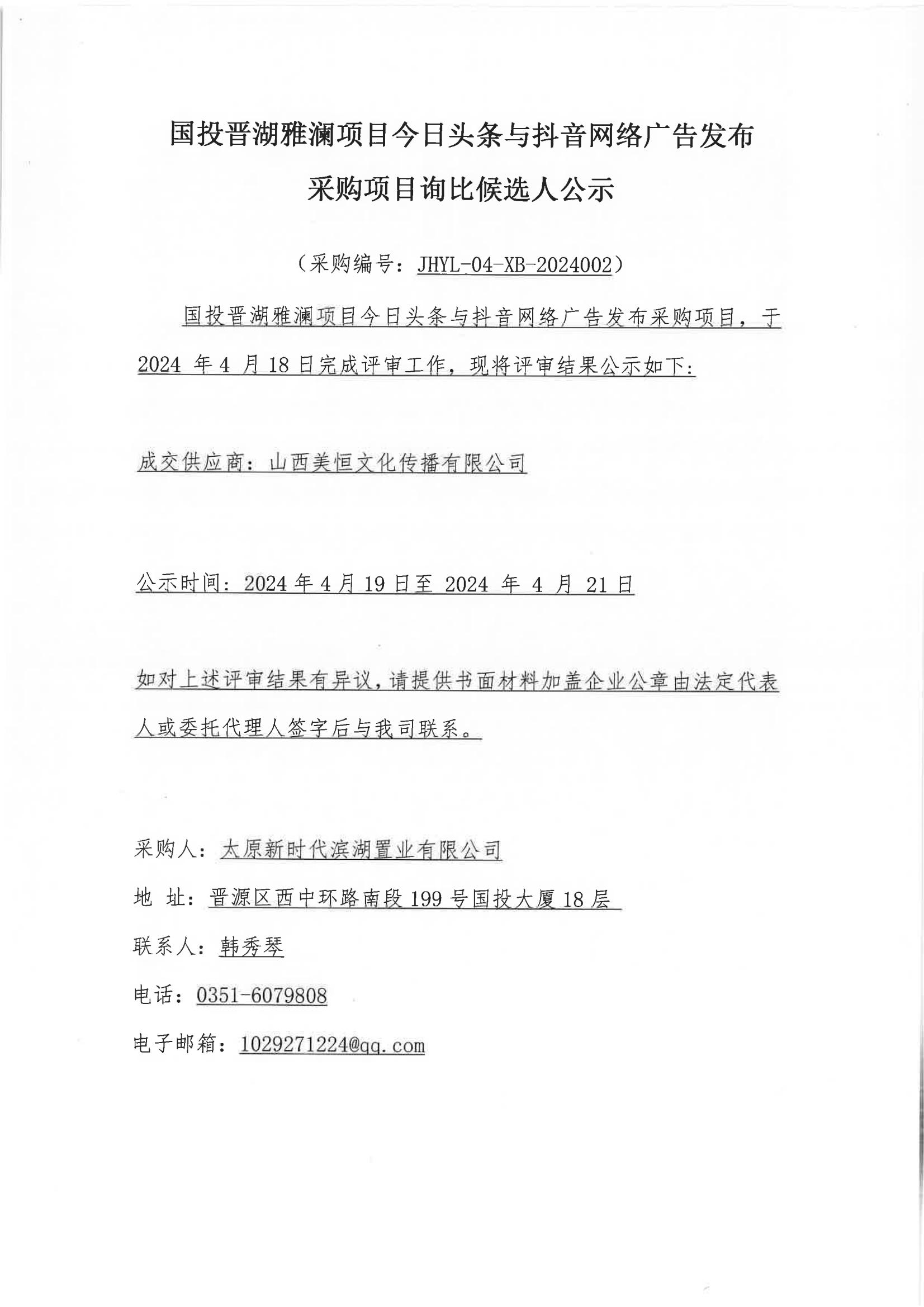 國投晉湖雅瀾項目今日頭條與抖音網(wǎng)絡(luò)廣告發(fā)布采購項目詢比候選人公示