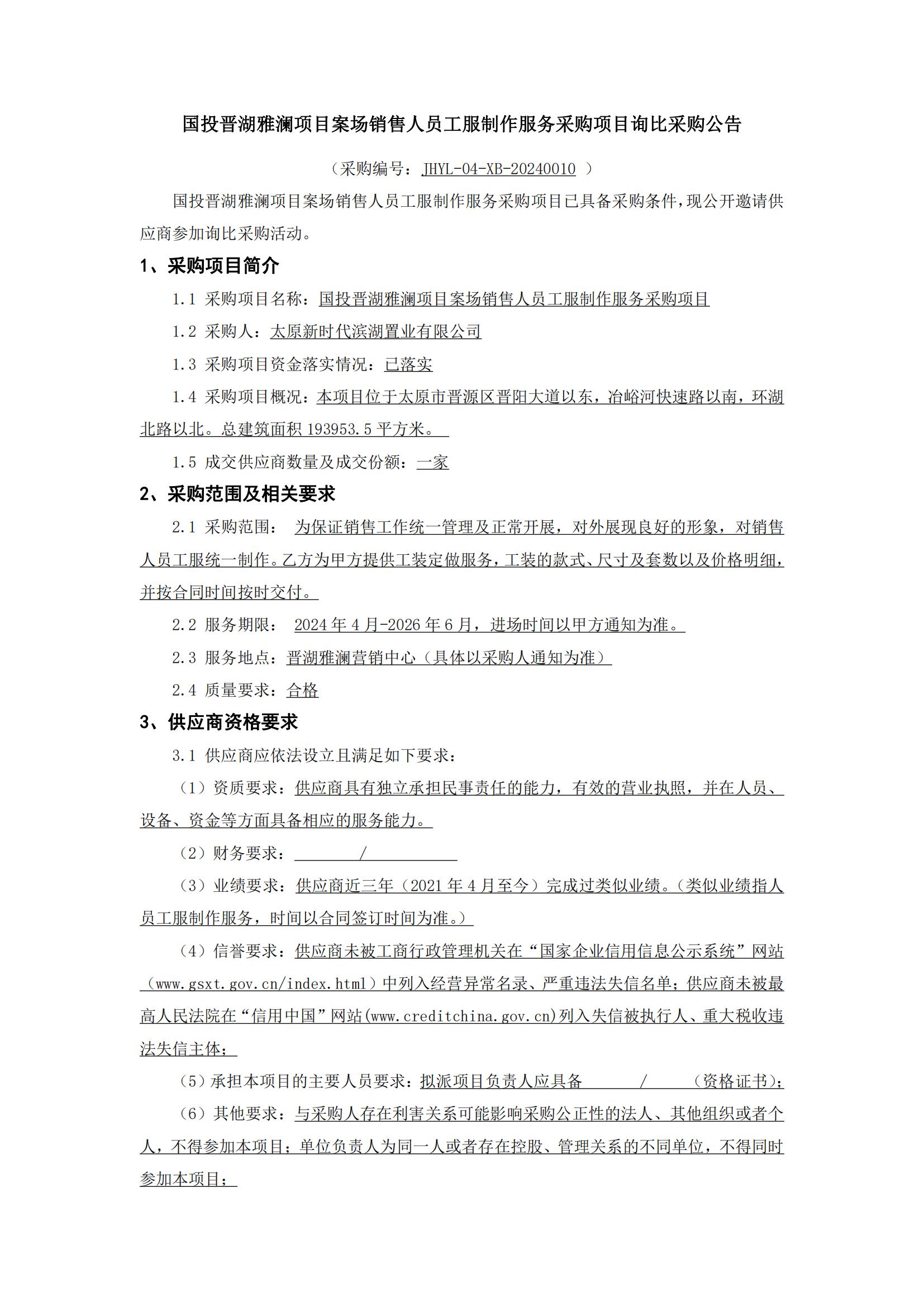 國投晉湖雅瀾項目案場銷售人員工服制作服務(wù)采購項目詢比采購公告