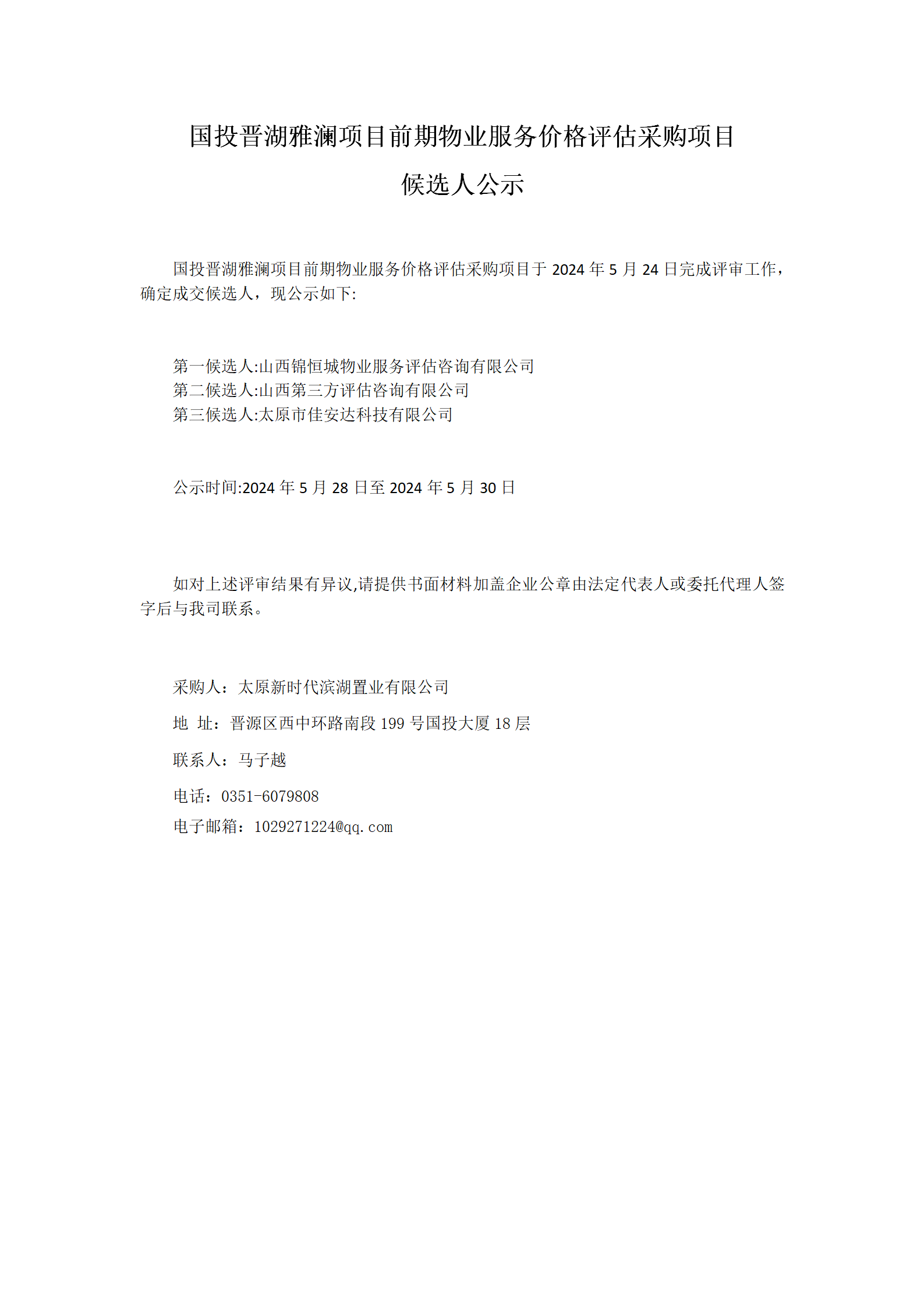 國投晉湖雅瀾項目前期物業(yè)服務(wù)價格評估采購項目候選人公示