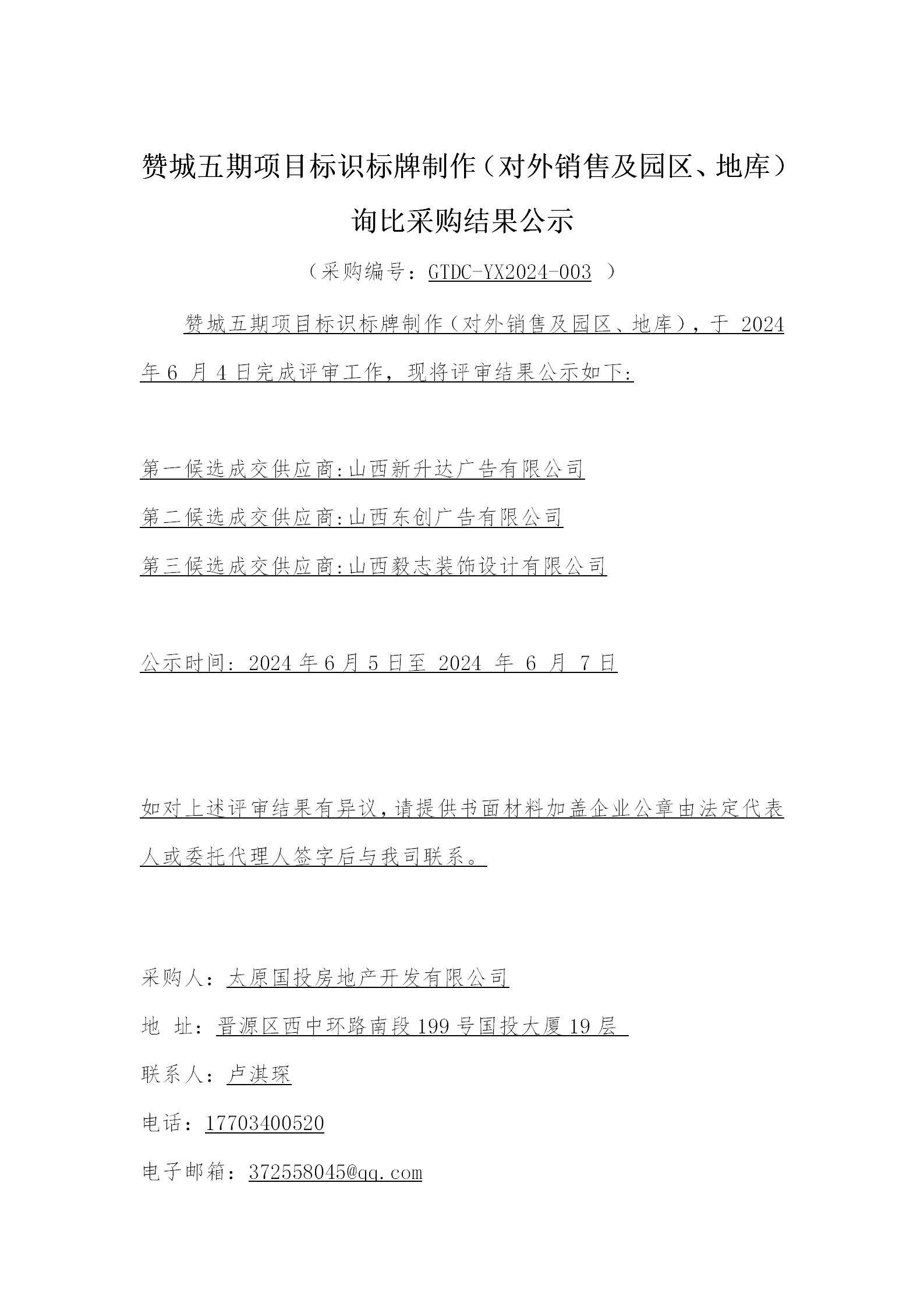 贊城五期項(xiàng)目標(biāo)識(shí)標(biāo)牌制作(對(duì)外銷售及園區(qū)、地庫(kù))詢比采購(gòu)結(jié)果公示