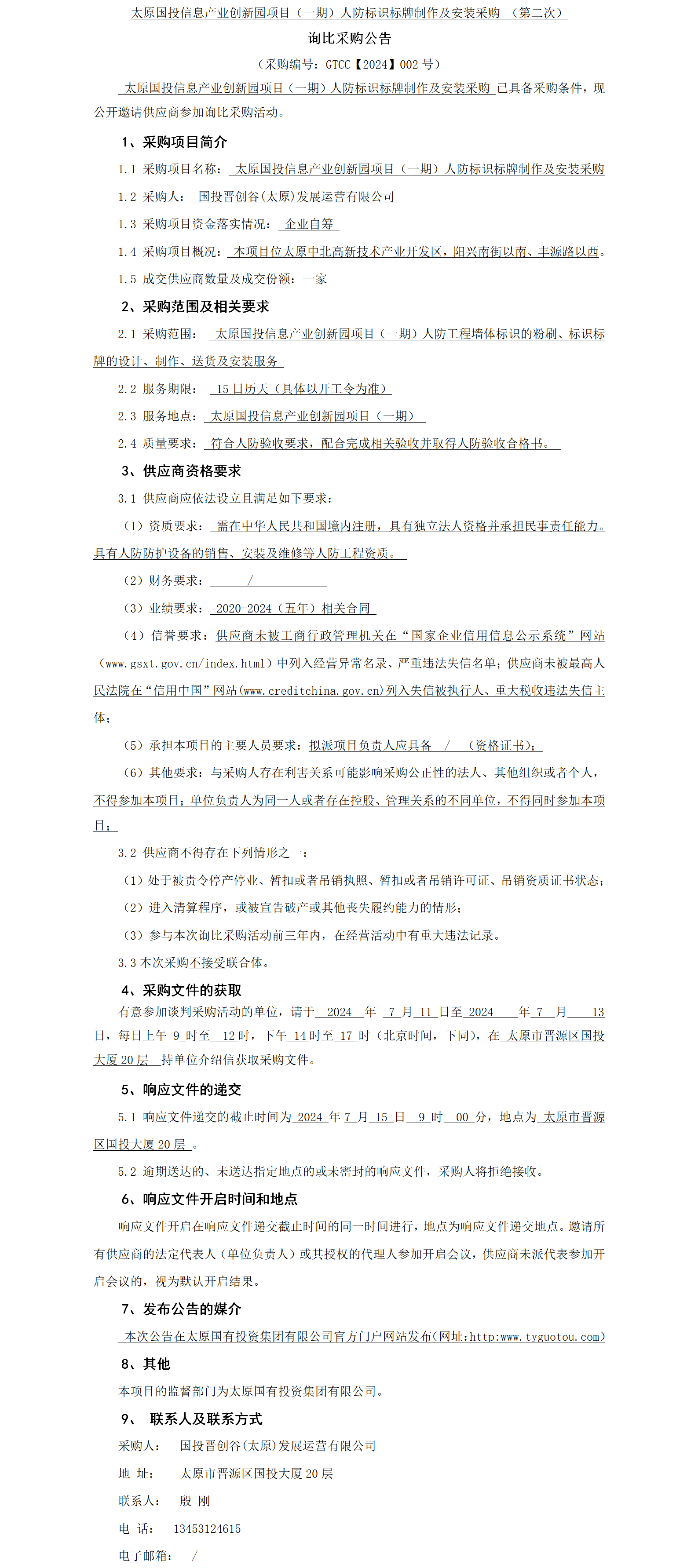 太原國(guó)投信息產(chǎn)業(yè)創(chuàng)新園項(xiàng)目(一期)人防標(biāo)識(shí)標(biāo)牌制作及安裝采購(gòu)(第二次) 詢比采購(gòu)公告