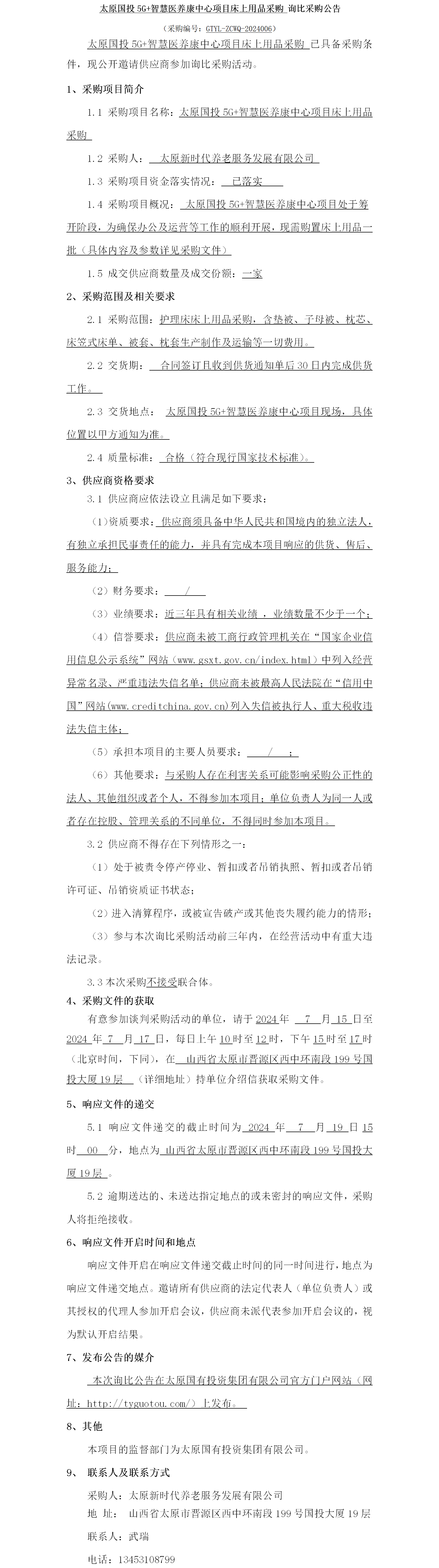 太原國投5G+智慧醫(yī)養(yǎng)康中心項目床上用品采購 詢比采購公告