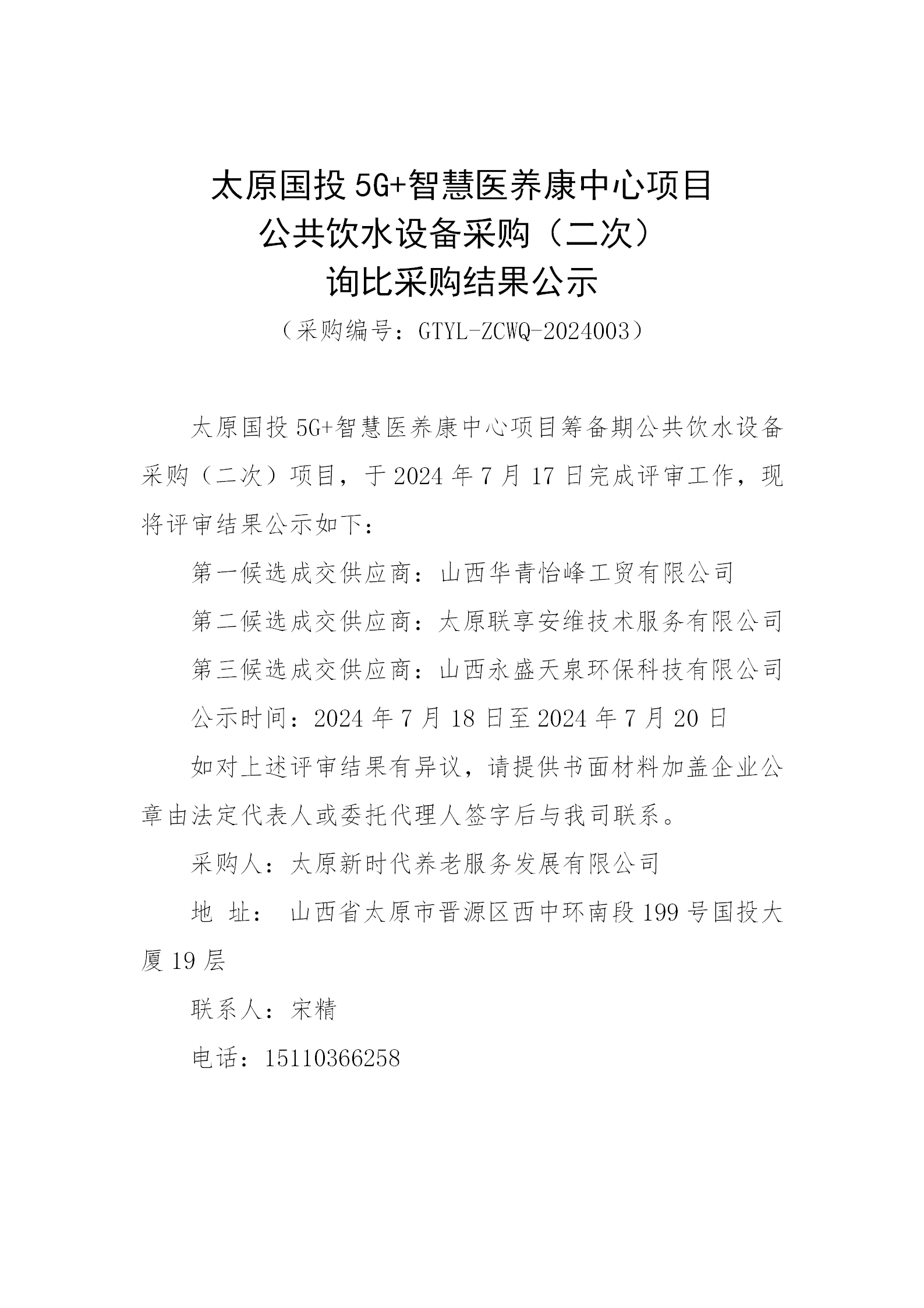 太原國投5G+智慧醫(yī)養(yǎng)康中心項目公共飲水設(shè)備采購(二次)詢比采購結(jié)果公示