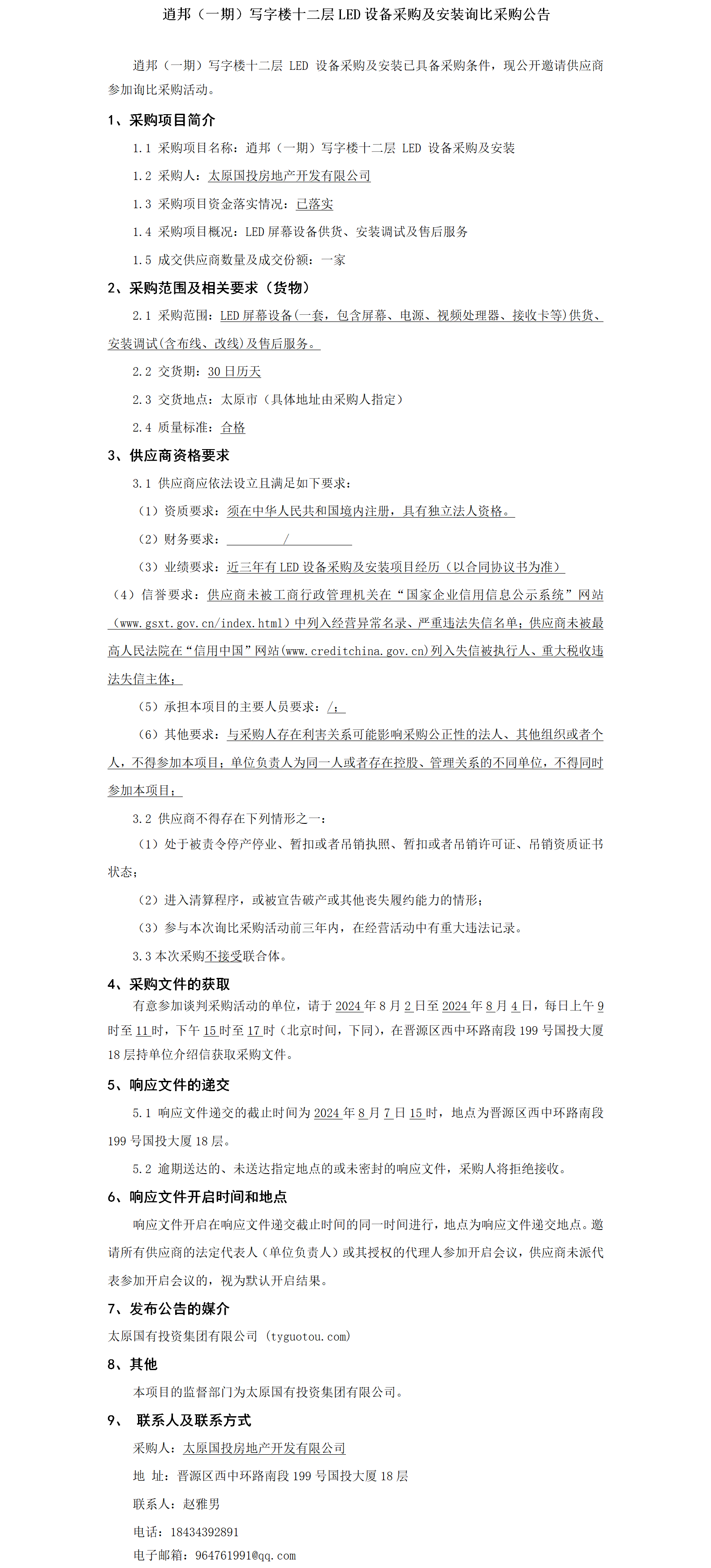 逍邦(一期)寫字樓十二層LED設(shè)備采購及安裝詢比采購公告