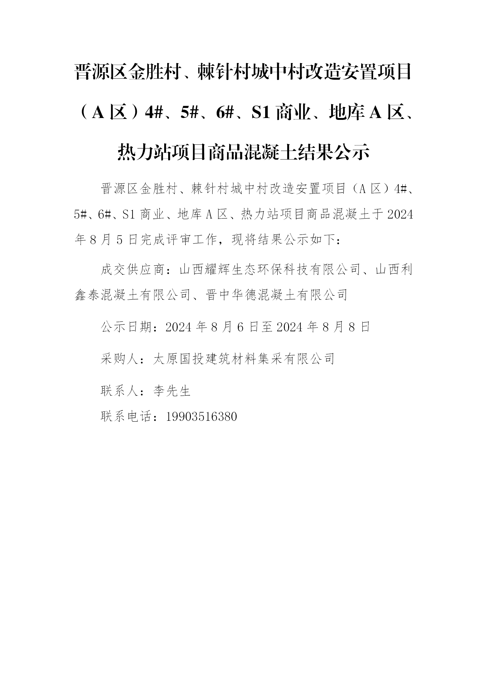 晉源區(qū)金勝村、棘針村城中村改造安置項目(A區(qū))4#、5#、6#、S1商業(yè)、地庫A區(qū)、熱力站項目商品混凝土結(jié)果公示