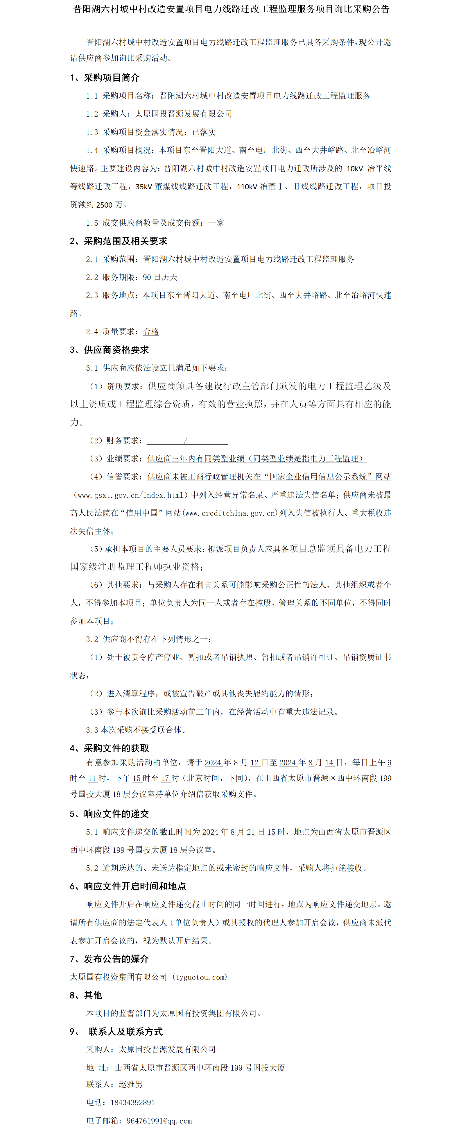 晉陽(yáng)湖六村城中村改造安置項(xiàng)目電力線路遷改工程監(jiān)理服務(wù)項(xiàng)目詢比采購(gòu)公告
