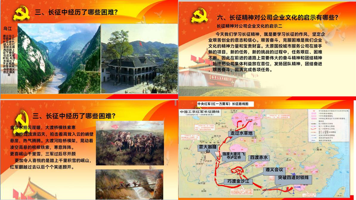 為深入學(xué)習(xí)黨的歷史,傳承紅色基因,弘揚偉大長征精神,進一步增強黨員的責(zé)任感、使命感,提升全體黨員及員工的凝聚力和戰(zhàn)斗力,太原國投城市服務(wù)有限公司(以下簡稱“太原國投城市服務(wù)”)于8月16日下午舉辦了一場主題為“弘揚長征精神”的黨課活動?;顒佑商瓏冻鞘蟹?wù)副總經(jīng)理韓成元同志主講,太原國投城市服務(wù)全體領(lǐng)導(dǎo)員工及輔業(yè)公司相關(guān)人員參與,共同回顧了那段波瀾壯闊的歷史,深刻領(lǐng)悟長征精神的時代價值。