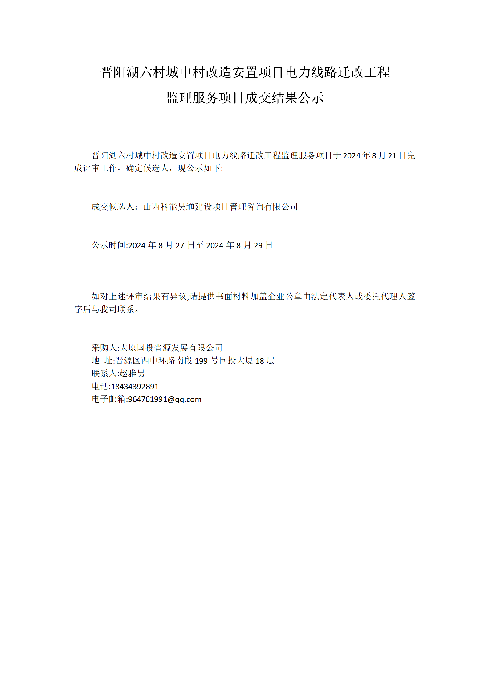 晉陽(yáng)湖六村城中村改造安置項(xiàng)目電力線路遷改工程監(jiān)理服務(wù)項(xiàng)目成交結(jié)果公示