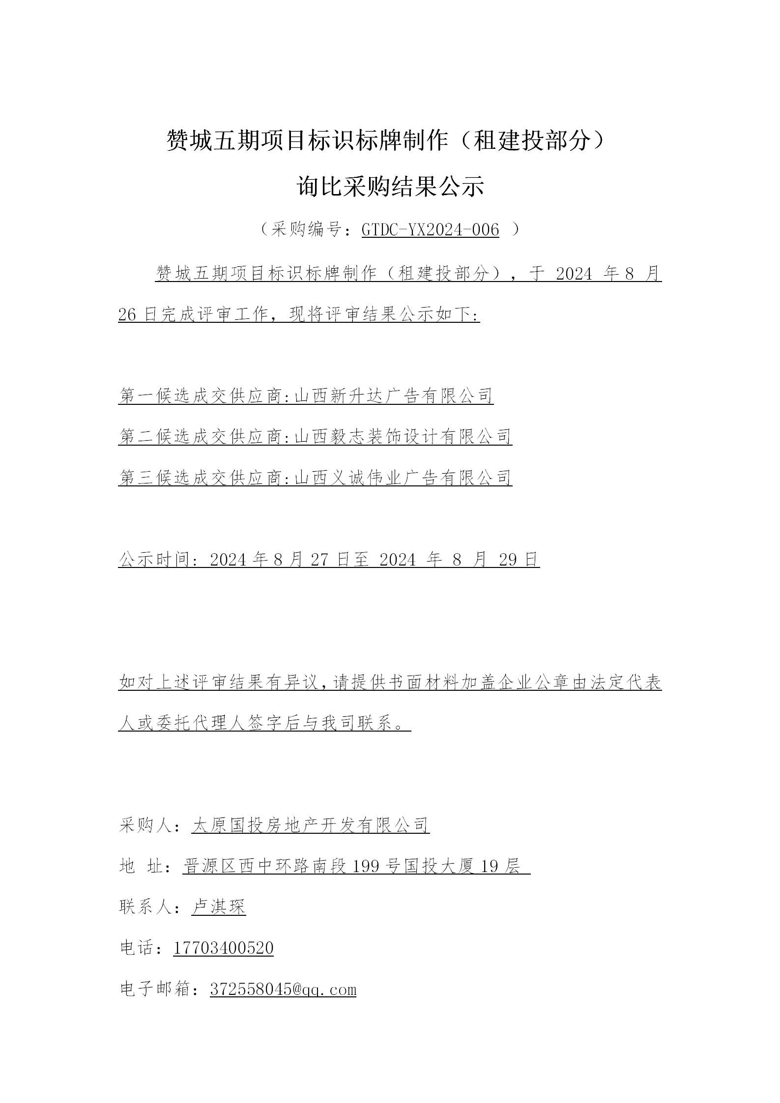 贊城五期項目標(biāo)識標(biāo)牌制作(租建投部分)詢比采購結(jié)果公示