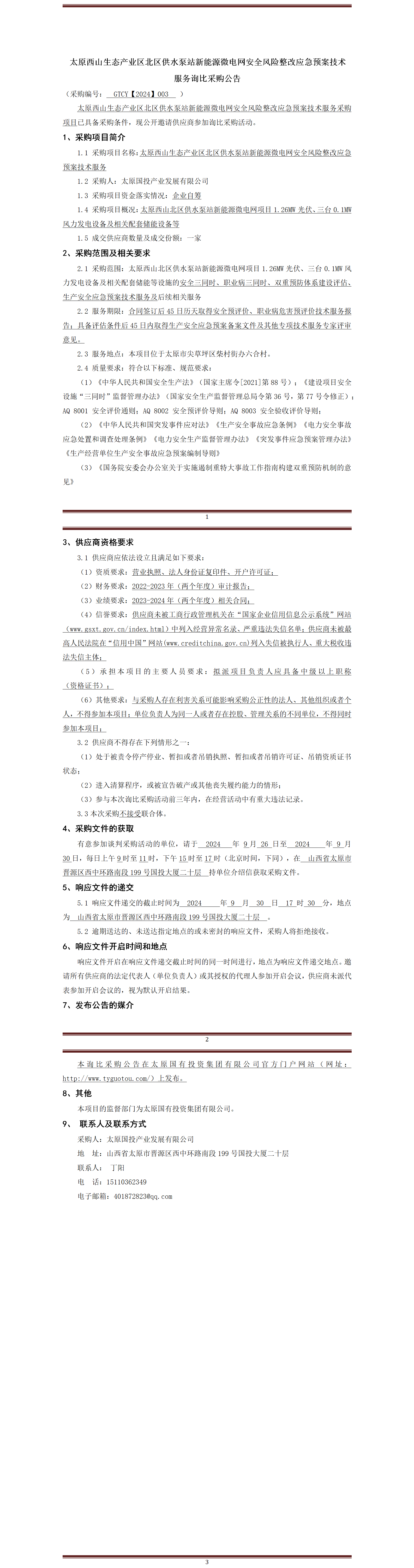 太原西山生態(tài)產(chǎn)業(yè)區(qū)北區(qū)供水泵站新能源微電網(wǎng)安全風(fēng)險(xiǎn)整改應(yīng)急預(yù)案技術(shù)服務(wù)詢(xún)比采購(gòu)公告