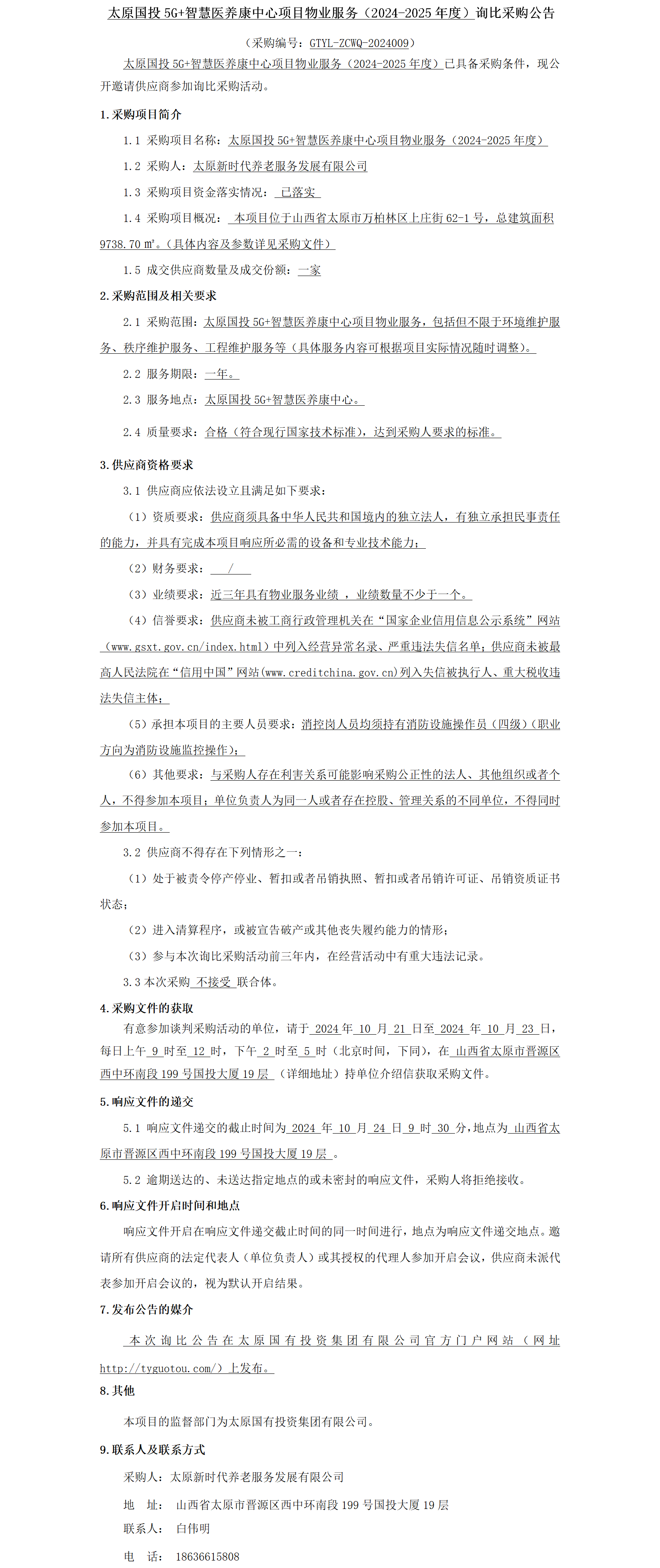 太原國投5G+智慧醫(yī)養(yǎng)康中心項(xiàng)目物業(yè)服務(wù)(2024-2025年度)詢比采購公告